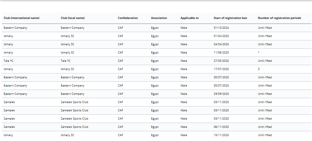 أعلن الموقع الرسمي الخاص بإيقاف قيد الأندية المصرية التابع للاتحاد الدولي لكرة القدم “فيفا”، إيقاف قيد جديد على نادي الإسماعيلي.