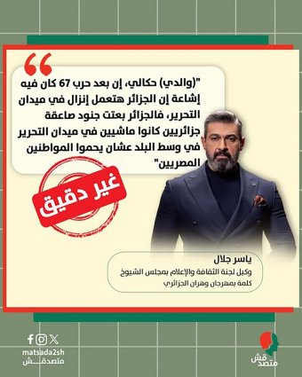 تداول مستخدمون تصريحات منسوبة لوكيل لجنة الثقافة والإعلام بمجلس الشيوخ المصري، الفنان ياسر جلال، زعم فيها أن الجزائر أرسلت جنود صاعقة لحماية ميدان التحرير في القاهرة بعد هزيمة حزيران/ يونيو 1967، المعروفة بـ”النكسة”.