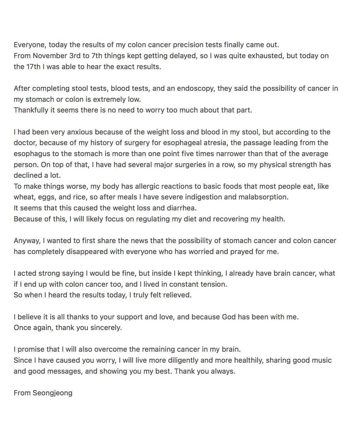 أعلن Heo Seongjeong (Studio L, CLASSMATE) أن اختبارات سرطان القولون التي أجراها جاءت سلبية