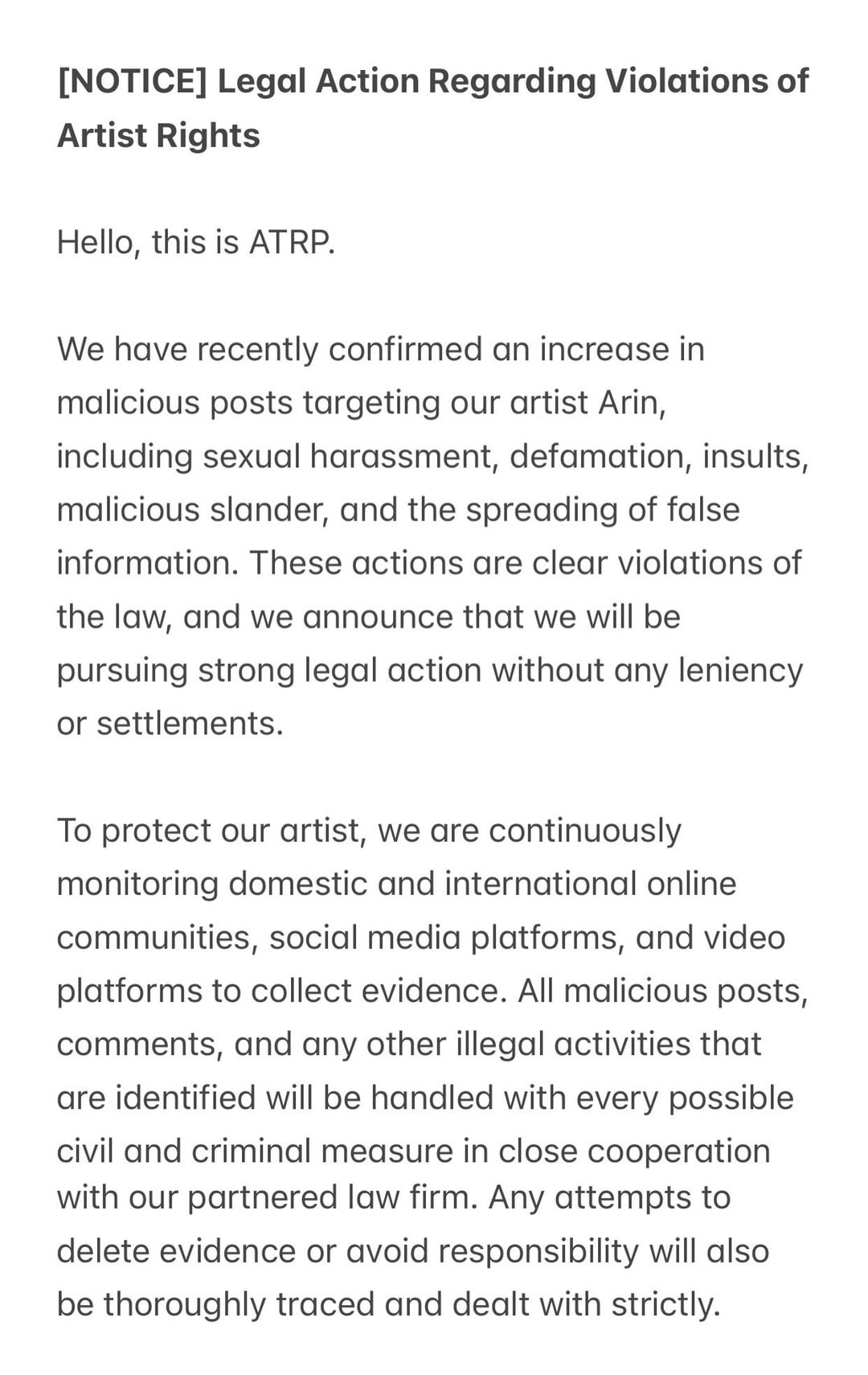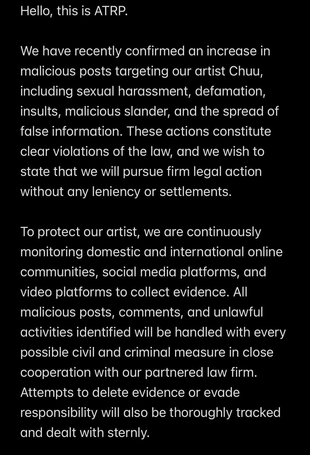 تعلن ATRP عن اتخاذ إجراء قانوني صارم ضد المنشورات الخبيثة التي تستهدف Chuu وOh My Girl Arin k-pop K-pop news Kpop kpop news