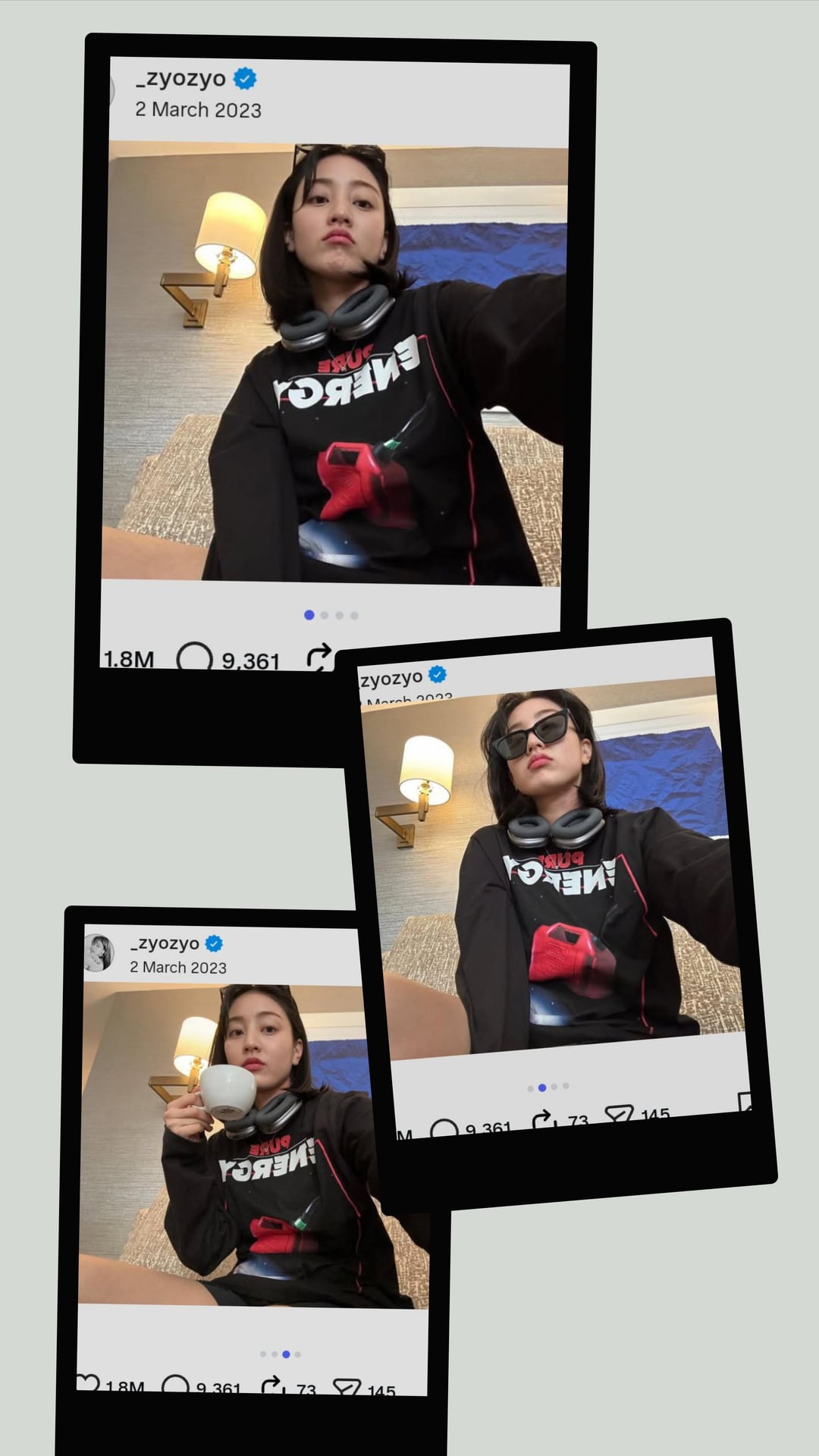 أيضًا، في مارس 2023، نشرت أربع صور في منشور لها وهي ترتدي سماعات الرأس وتحتسي الشاي، والخلفية تبدو وكأنها استوديو صوتي أو شيء من هذا القبيل. والآن مرة أخرى في 15 أكتوبر 2025، نشرت 6 صور لها وهي ترتدي سماعات الرأس، تلك الصور كلها تبدو في نفس اليوم، وكانت تحمل زجاجة ستانلي، والتي لا يستخدمها الناس أثناء الاستكشاف العادي أو التجول حول السائح، والتي تستخدم عادة في العمل. إذا كانت تستكشف المدينة وتسافر فقط في جميع أنحاء المدينة، فسنفترض أنها تحمل زجاجة ستانلي كبيرة، ويبدو أنها كانت ذاهبة للعمل، ومع الأخذ في الاعتبار منشورها القديم، الذي نشرته في 15 مارس وخرجت منفردة في 15 أغسطس، والآن مرة أخرى نشرت صورة لجميع سماعات الرأس في 15 أكتوبر 2025، ألا يعني الآن أنها تلمح إلى عملها المنفرد؟