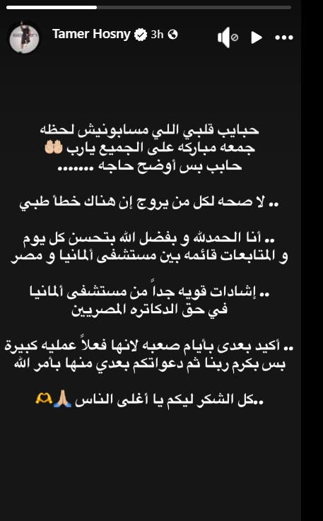 وعليه، قرر تامر حسني أن يرد عبر حساباته الرسمية على مواقع التواصل الاجتماعي، على ما قيل حول حالته الصحية، ونشر عبر خاصية القصص المصورة قائلاً: “حبايب قلبي اللي مسابونيش لحظة.. جمعة مباركة على الجميع يارب.. حابب بس أوضح حاجة”.