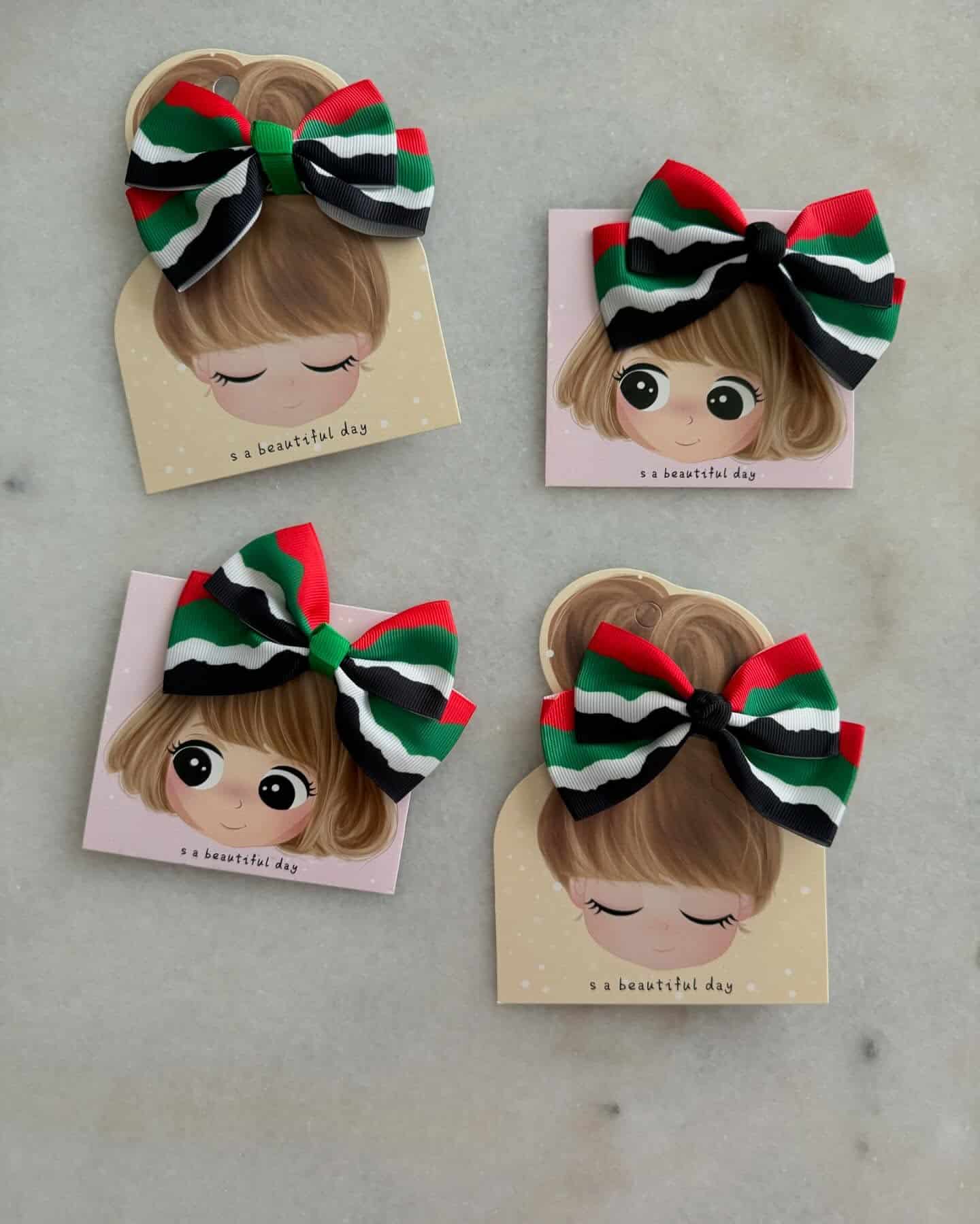 توك شعر أنيقة تحمل شرائط بألوان العلم أو وردات صغيرة مستوحاة من التراث الإماراتي، تضيف لمسة جمالية وتفرح الصغيرات.