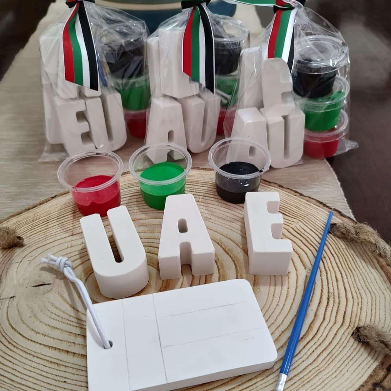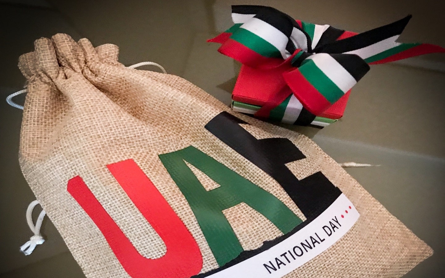 توزيع قطع حلوى مزينة بألوان العلم الإماراتي أو مطبوع عليها رقم العيد الوطني، مما يضيف لمسة احتفالية لذيذة يحبها الأطفال.