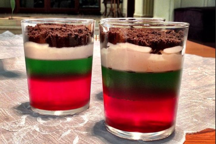 أكواب جيلي مقسمة طبقات بألوان الأحمر والأخضر والأبيض والأسود، تُعد من أكثر التوزيعات التي تسعد الأطفال وتضيف لمسة احتفالية لذيذة.