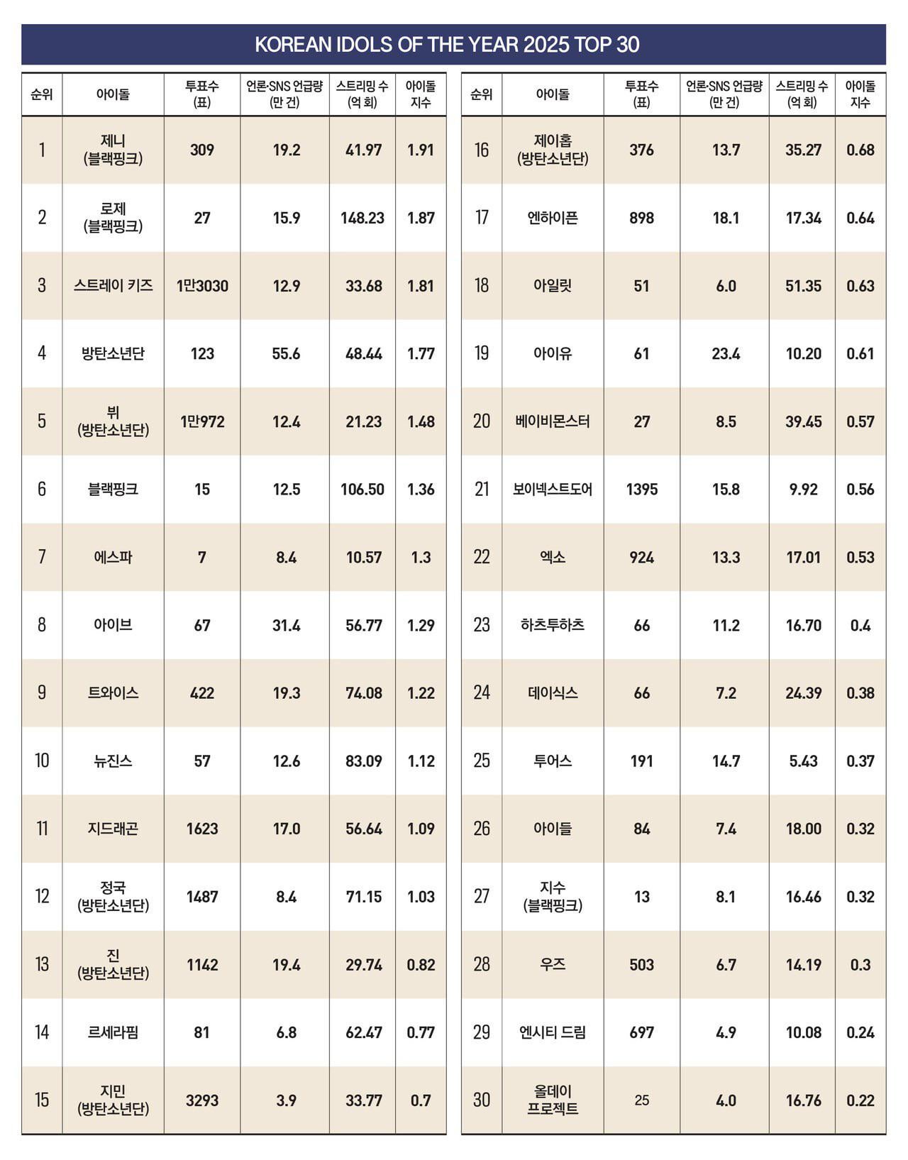 251201 IVE احتلوا المركز الثامن في قائمة فوربس كوريا لأفضل 30 آيدولز كوري لعام 2025