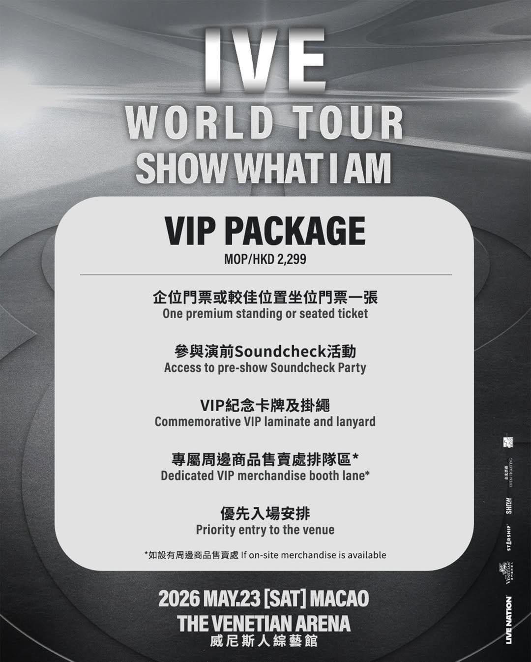 يمكن العثور على مزيد من المعلومات حول تاريخ ماكاو هنا، وسيتم البيع المسبق في الأسبوع المقبل يوم الأربعاء 10 ديسمبر والبيع العام سيتم يوم الخميس 11 ديسمبر https://www.livenation.hk/event/ive-world-tour-show-what-i-am-in-macao-macao-tickets-edp1641069