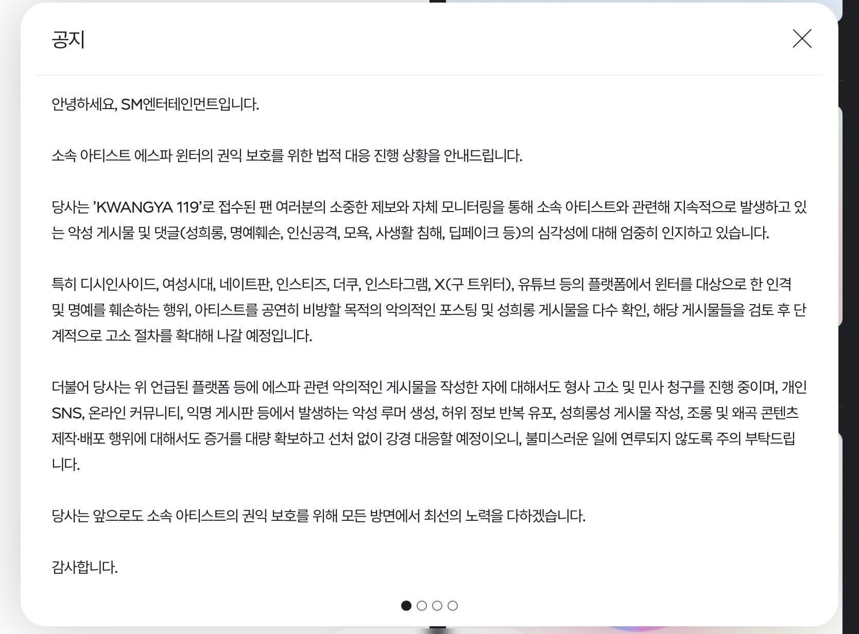 نود أن نعلمك بتقدم إجراءاتنا القانونية لحماية حقوق ومصالح فناننا وينتر (aespa).