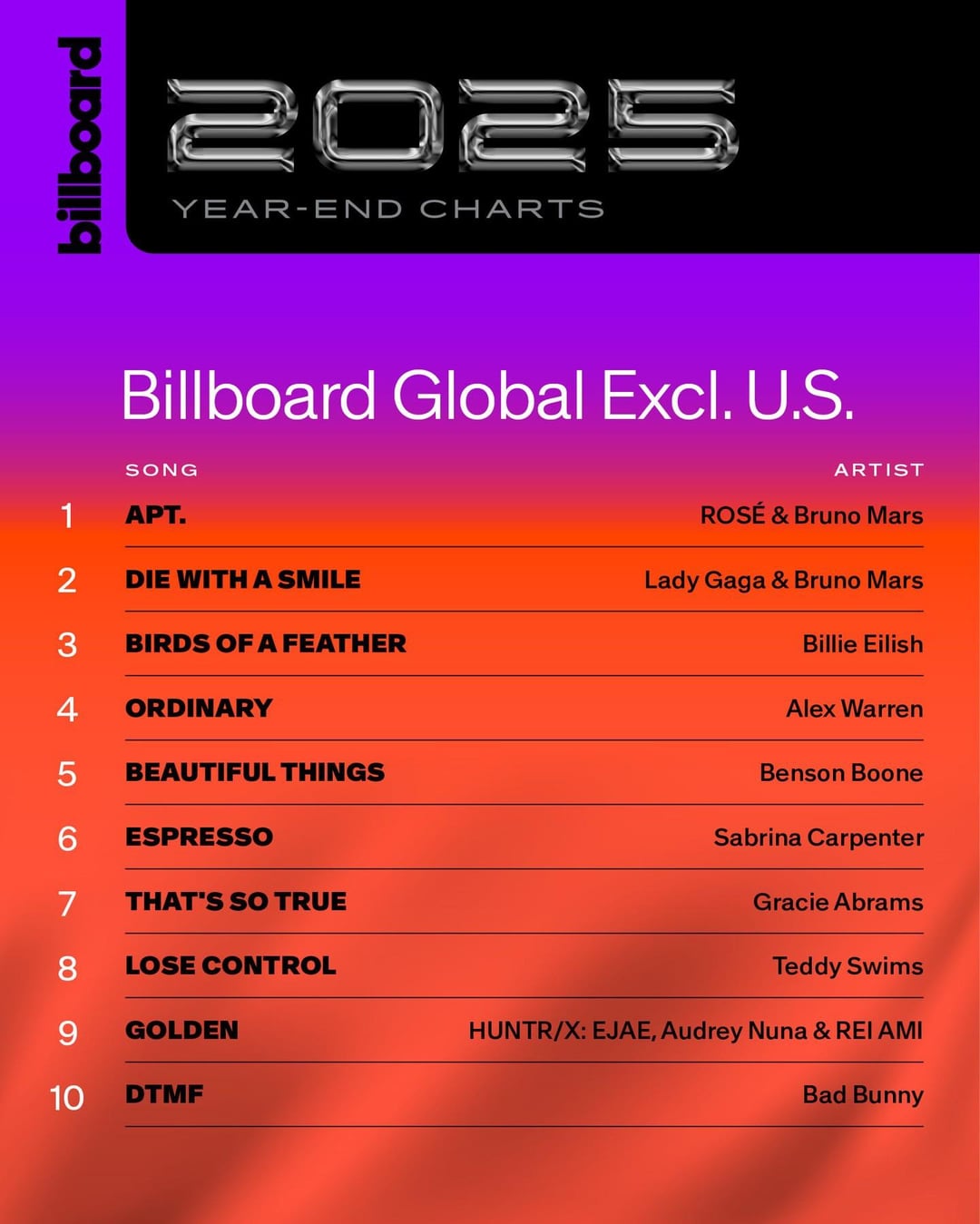 روزي وبرونو مارس – “APT”. يهيمن على مخططات Billboard لنهاية العام 2025، حيث وصل إلى المركز الأول في كل من Billboard Global 200 وGlobal Excl لعام 2025. نحن!