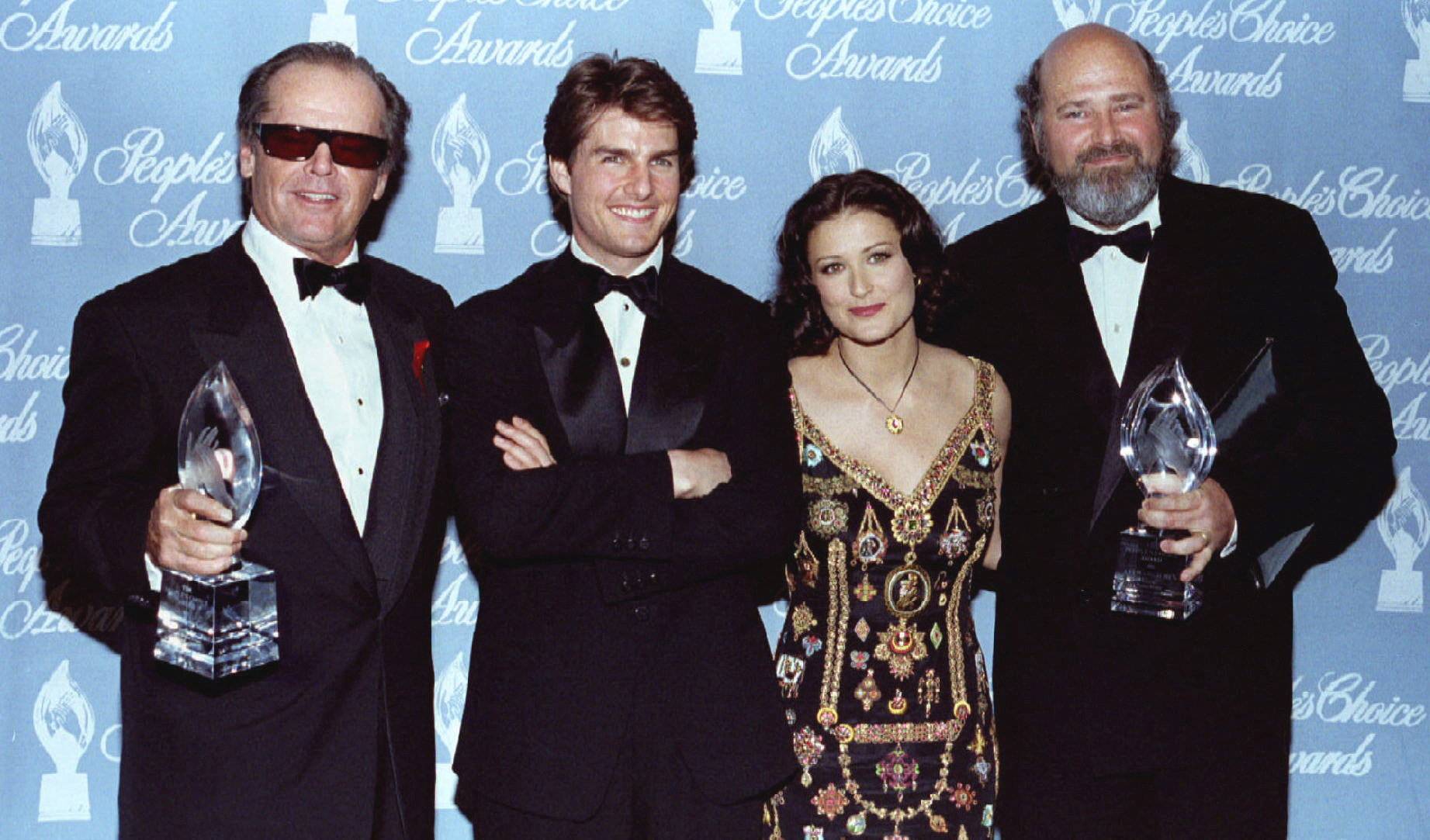 من اليسار: جاك نيكلسون وتوم كروز وديمي مور ومخرج فيلم «رجال صالحون قليلون» روب راينر يقفون معاً في 9 مارس 1992 بعد فوزهم بجائزتي اختيار الجمهور لأفضل فيلم درامي وأفضل فيلم (رويترز)