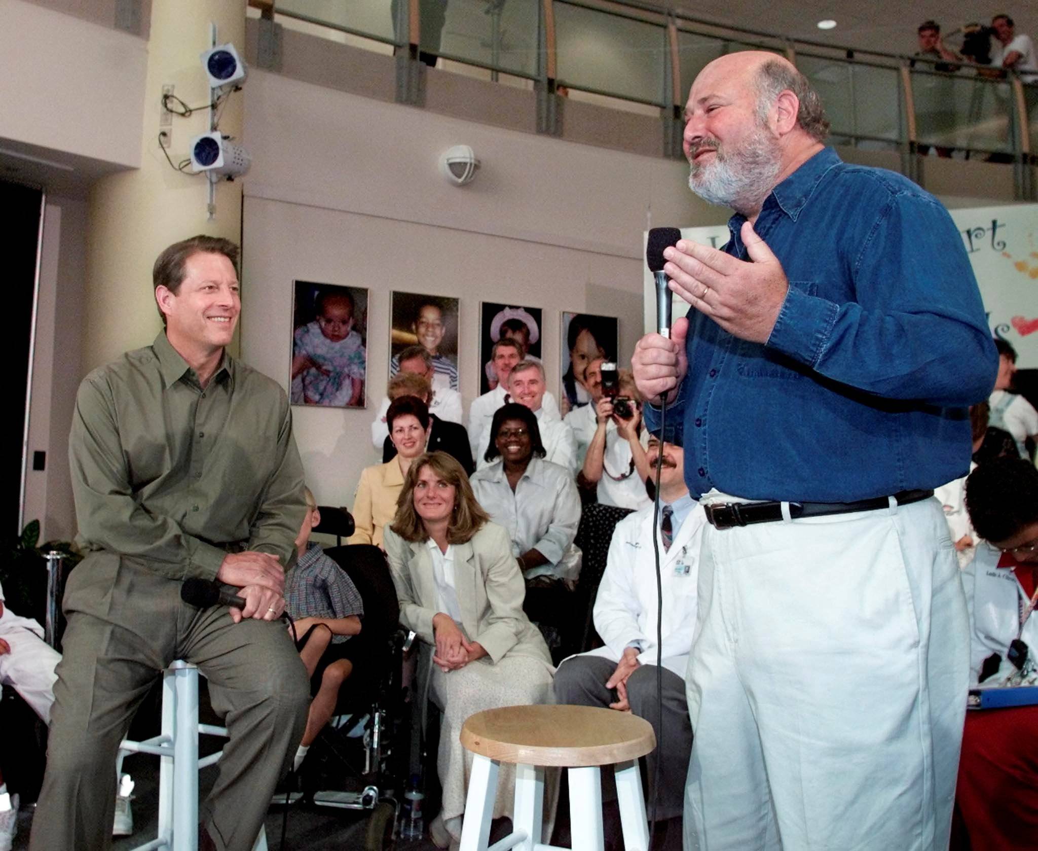 نائب الرئيس الأميركي والمرشح الديمقراطي للرئاسة آل غور يستمع إلى حديث الممثل روب راينر خلال زيارته لمستشفى رينبو للأطفال في كليفلاند في 13 أغسطس 2000 (رويترز)