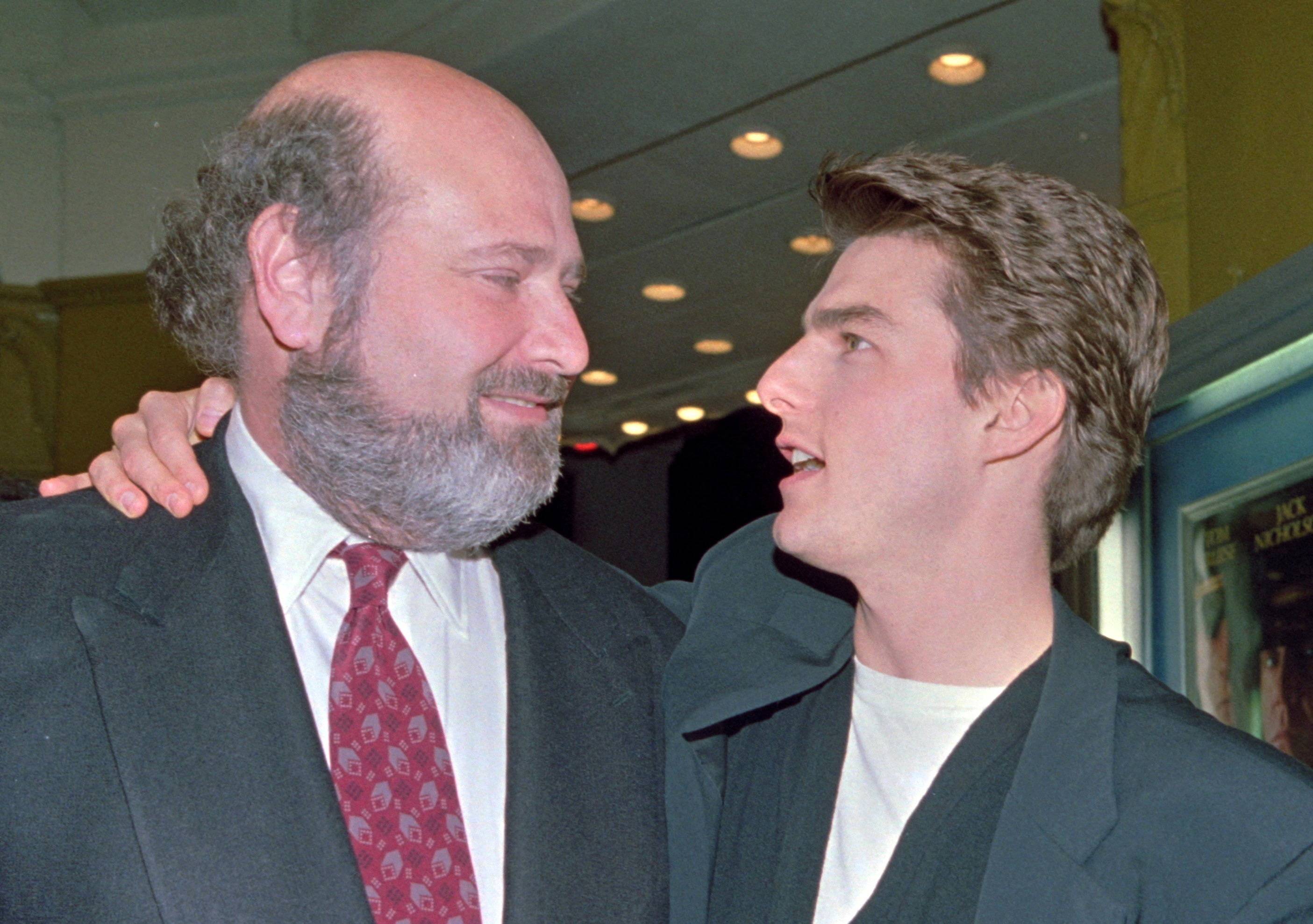 الممثل توم كروز (يمين) يتحدث مع المخرج روب راينر بعد وصولهما لحضور العرض الأول لفيلم راينر الجديد «رجال صالحون قليلون» في لوس أنجليس 9 ديسمبر 1992 (رويترز)