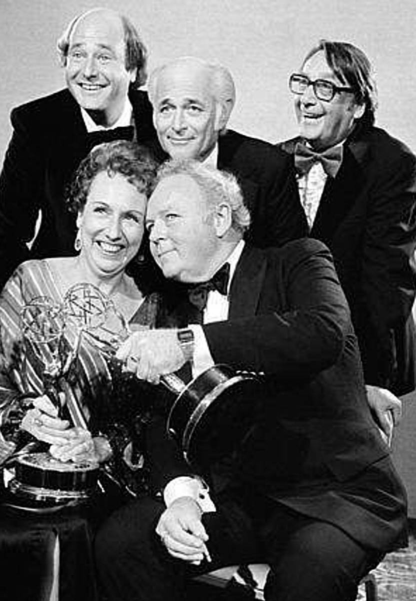 الممثلان جين ستابلتون (جالسة على اليسار) وكارول أوكونور (جالس على اليمين) يحملان جائزتي «إيمي» في لوس أنجليس 18 سبتمبر 1978 في الخلف من اليسار روب راينر الفائز بجائزة «إيمي» لأفضل ممثل مساعد في المسلسل نفسه ونورمان لير منتج المسلسل والمنتج التنفيذي مورت لاكمان (أ.ب)