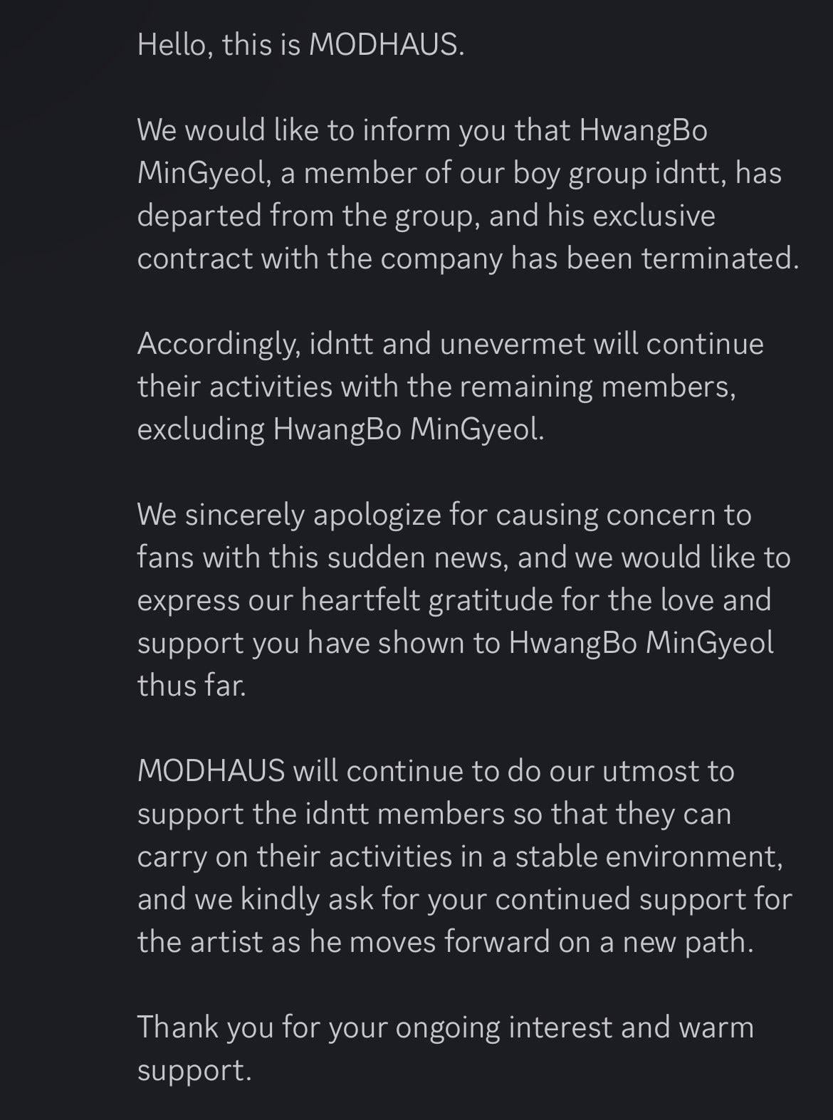 MODHAUS يعلن أن idntt Hwangbo Mingyeol قد ترك الفرقة رسميًا