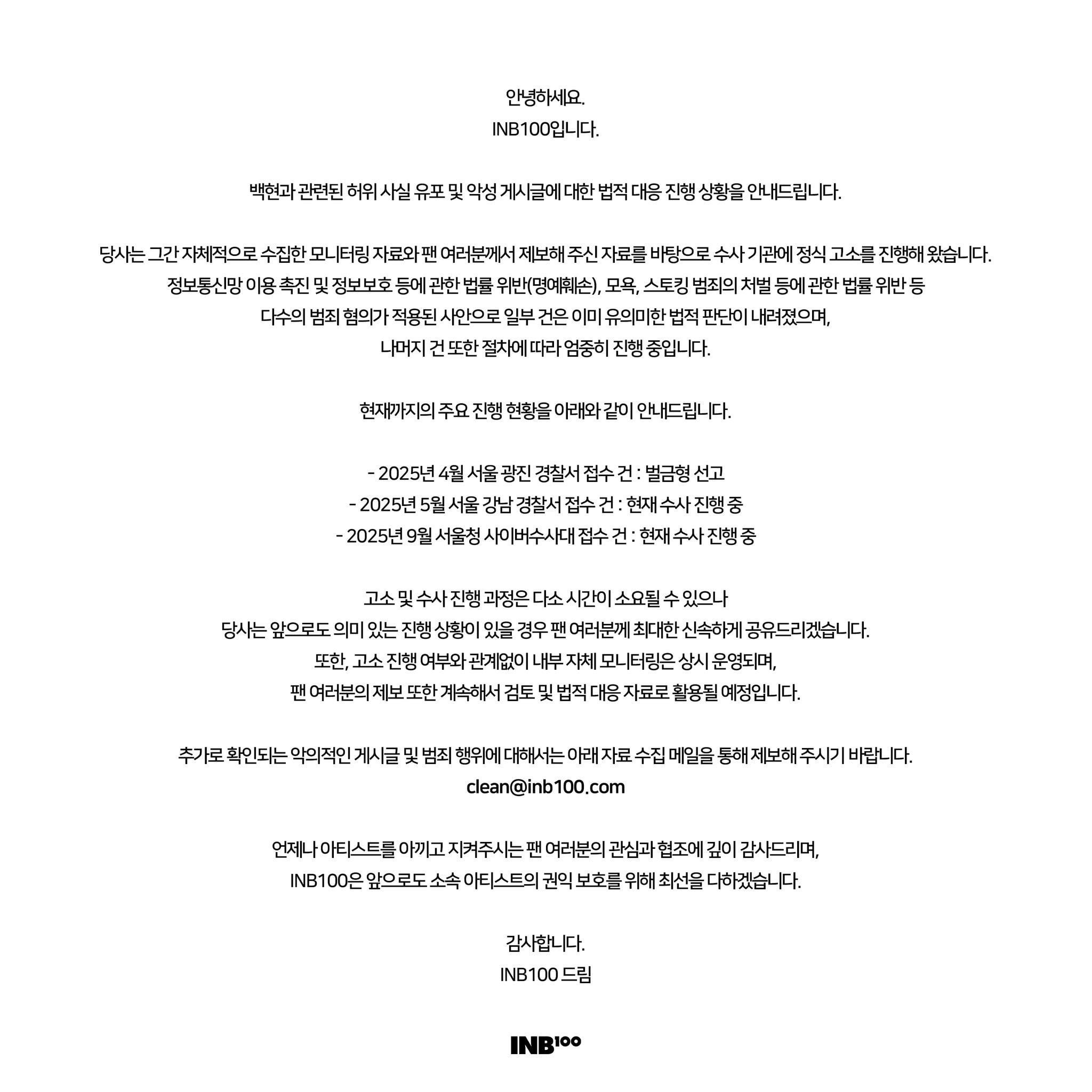 INB100 يعلن عن اتخاذ إجراء قانوني ضد المنشورات الخبيثة المتعلقة بـ BAEKHYUN (EXO)