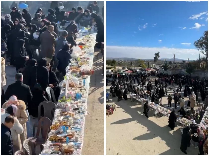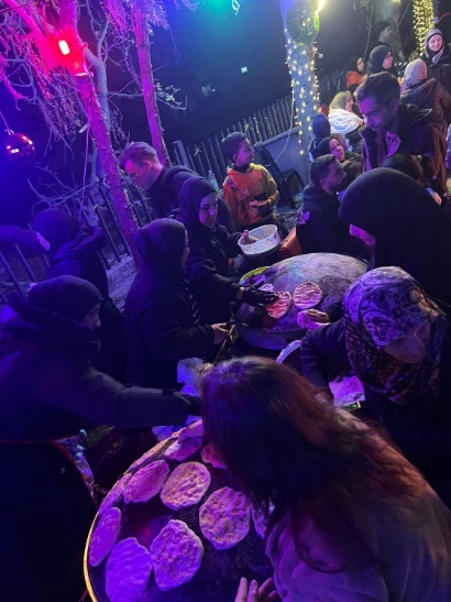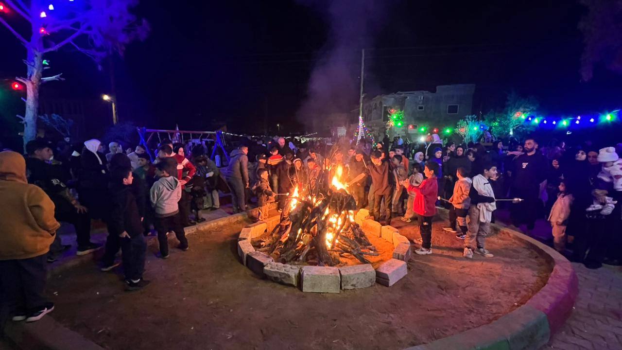 تنقش النساء أصابعهنّ على العجين، تمدّ واحدة الزعتر وزيت الزيتون البلدي عليه، ثمّ تقبع العجينة عن قبّة فرن الصاج وتُناوِل الكبار والصغار. يجول شباب بلباس شخصيات كرتونية على الأطفال ويرقصون معهم، ويأتي لهم “بابا نويل” بالهدايا في مفاجأة سارة. لا يهمّ إن كانت العائلات مسلمة أو مسيحية، الكلّ هناك، والفرحة يتقاسمها الجميع.