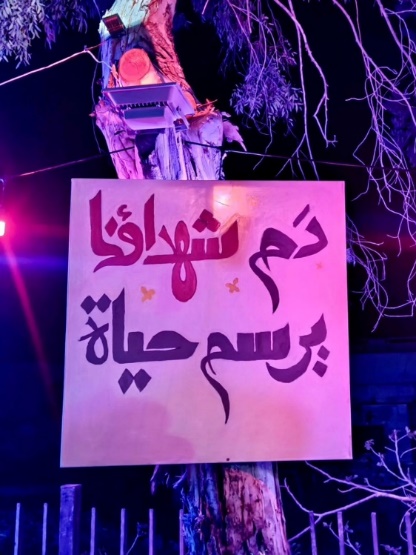 خلْفَ هذا المشهد كلّه، وعلى إحدى الأشجار في الحديقة، عُلّقت لوحة كُتب عليها “دم شهدائنا يرسم حياة”.