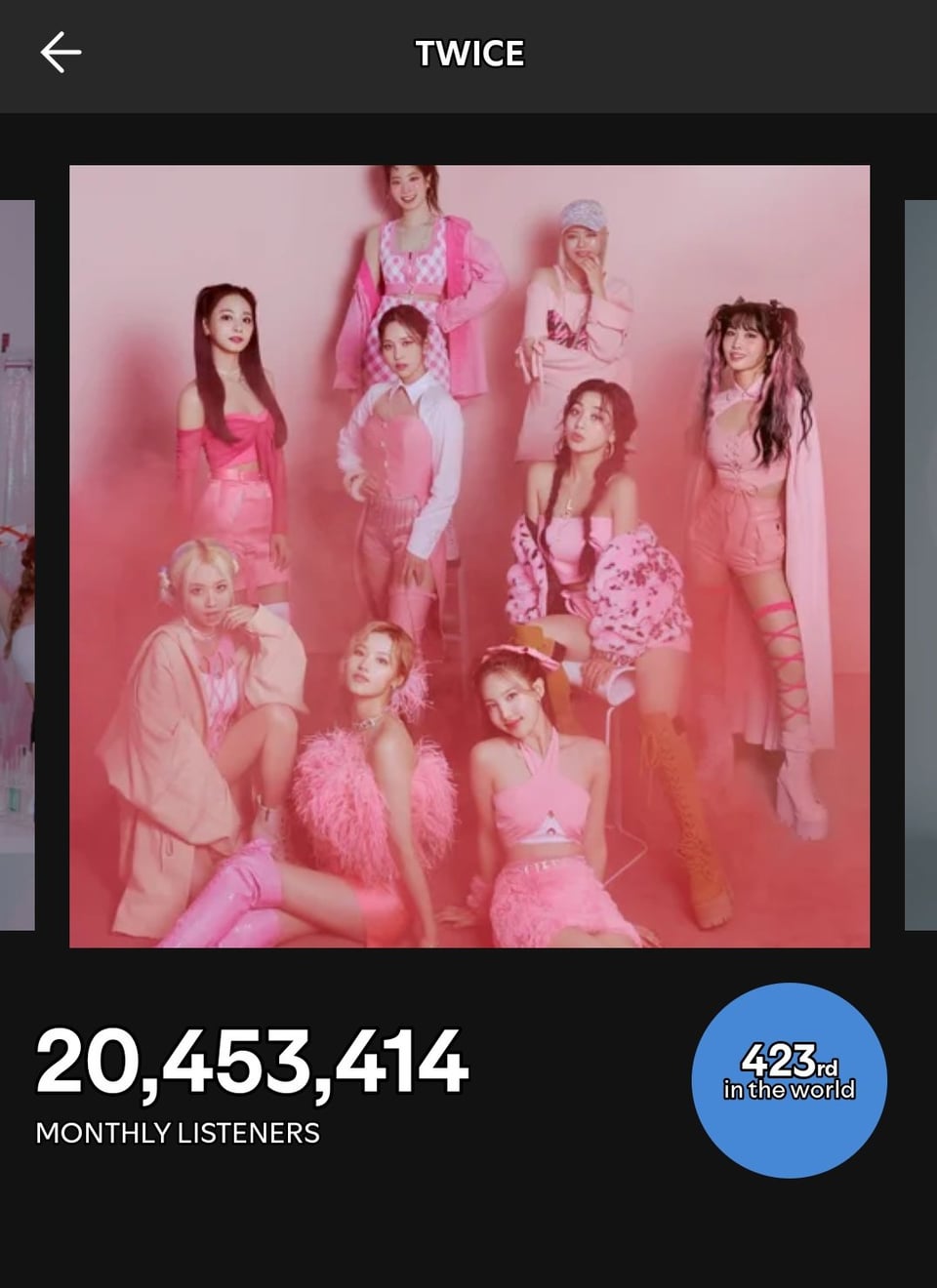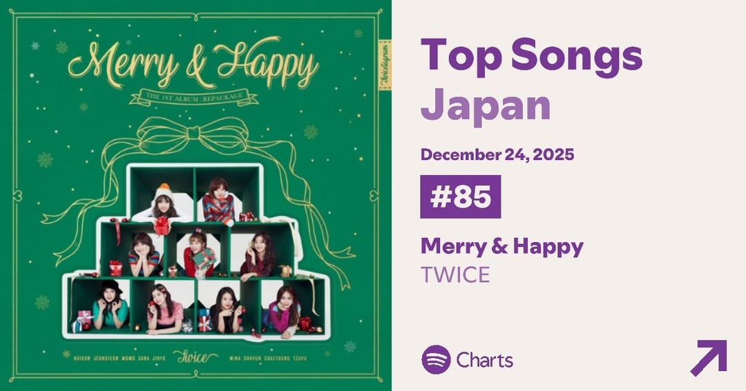251225 تحديث Spotify – تعود أغنية “Merry & Happy” إلى Spotify Daily Top Songs Japan في 24 ديسمبر في المركز 85 مع 90,039 استماعًا، وهو ثاني أكبر يوم بث على الإطلاق على الرسم البياني. إنها أغنية عيد الميلاد الوحيدة التي تم رسمها من قبل فرقة K-Pop. كما شهد عدد المستمعين الشهريين لـ TWICE ارتفاعًا طفيفًا → 20,453,414 [+38,355]