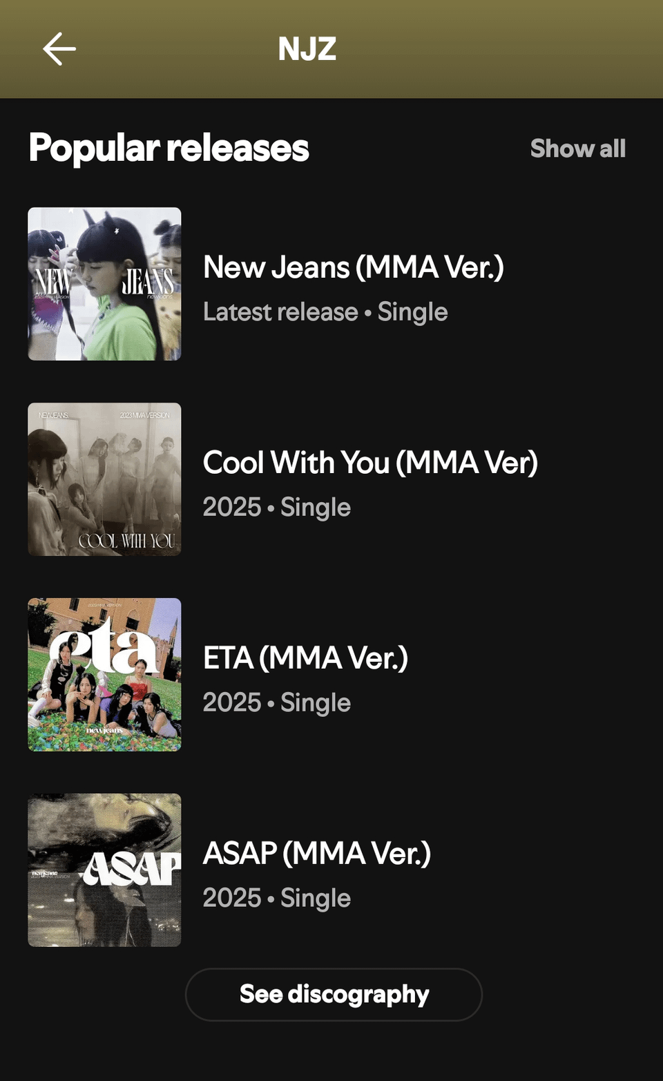 لقد لاحظت مؤخرًا أن ريمكسات MMA للأغاني يتم نشرها تحت حساب مختلف بكل بساطة "NJZ"، وليس لديهم سوى هذه الأغاني.