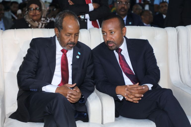الرئيس الصومالي حسن شيخ محمود (يسار) يتحدث مع رئيس الوزراء الإثيوبي أبي أحمد في مقديشو، الصومال، في 9 يونيو/حزيران 2022 (الفرنسية)
