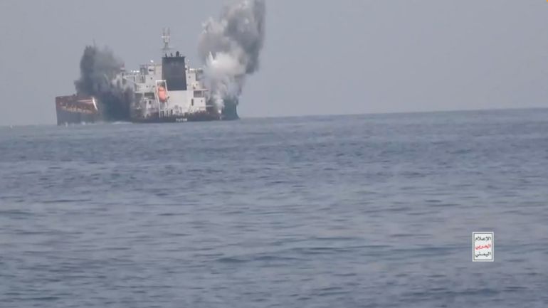 تصاعد الدخان بعد انفجار على متن سفينة شحن يونانية بعد تعرضها لهجوم من الحوثيين في البحر الأحمر (رويترز)