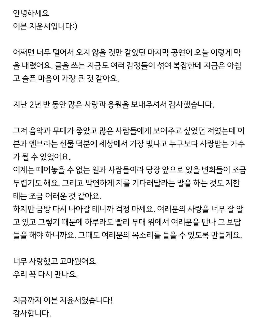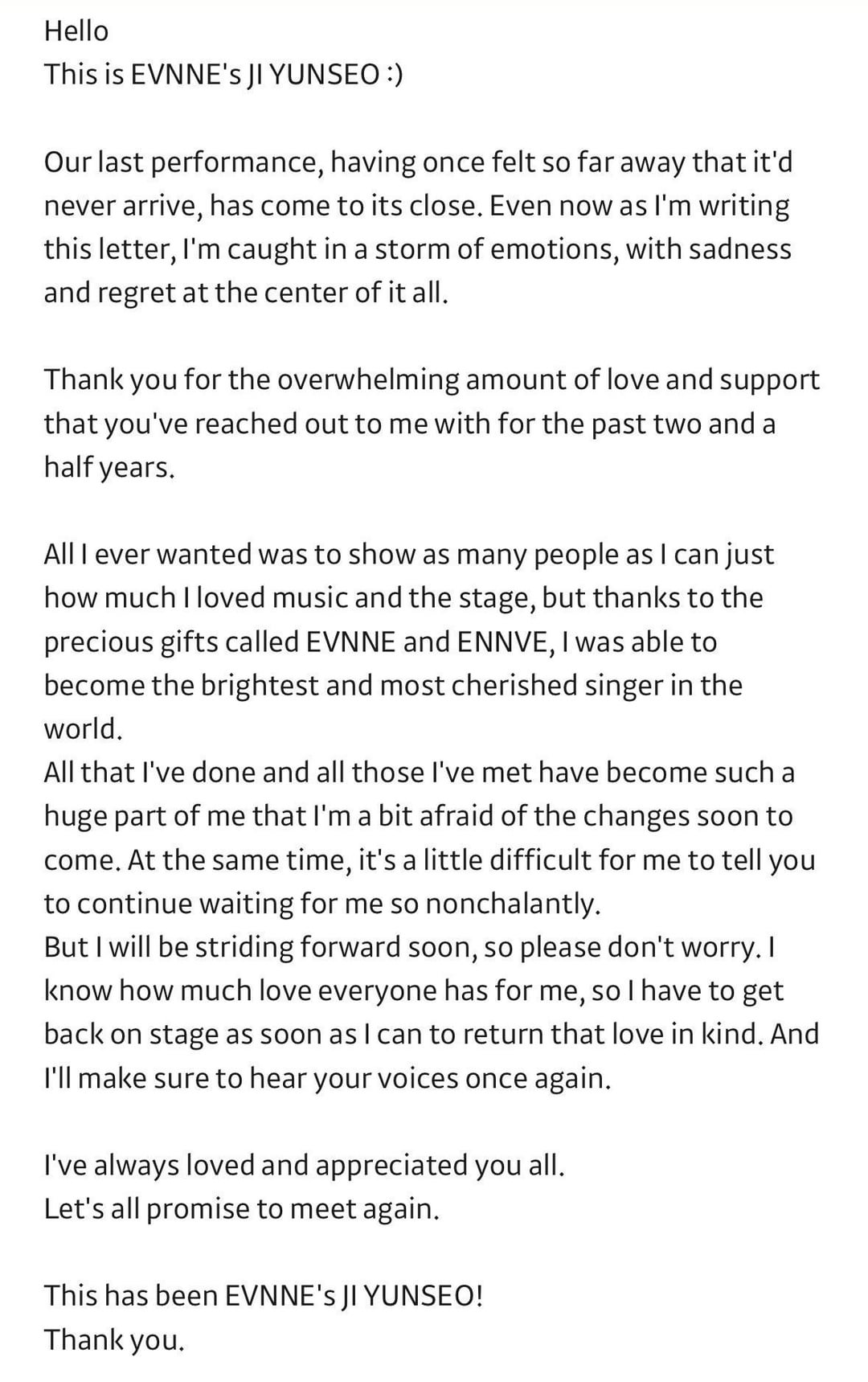 رسالة أقلام EVNNE Yunseo السابقة إلى المعجبين بعد النشاط الجماعي الأخير