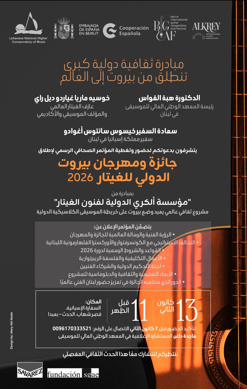 تنطلق من بيروت مبادرة ثقافية موسيقية مع الإعلان الرسمي عن جائزة ومهرجان بيروت الدولي للغيتار 2026، وذلك في مؤتمر صحافي يُعقد في 13 كانون الثانييناير الجاري في السفارة الإسبانية – قصر شهاب.