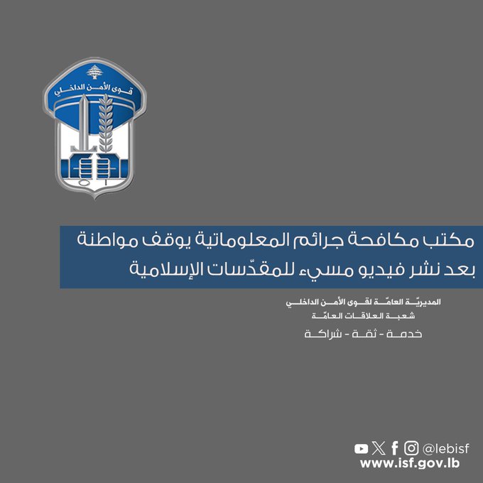 صدر عن قوى الأمن الداخلي – شعبة العلاقات العامة بيان، أفادت فيه بأنه على ضوء انتشار مقطع فيديو عبر مواقع التواصل الاجتماعي يتضمّن إساءة إلى الدين والشعائر والمقدّسات الإسلامية، وبعد المتابعة التي قامت بها القطعات المختصّة، أوقف مكتب مكافحة جرائم المعلوماتية وحماية الملكية الفكرية في وحدة الشرطة القضائية المدعوة م. ز. (مواليد 1962، لبنانية)، وذلك بناءً على إشارة القضاء المختص.