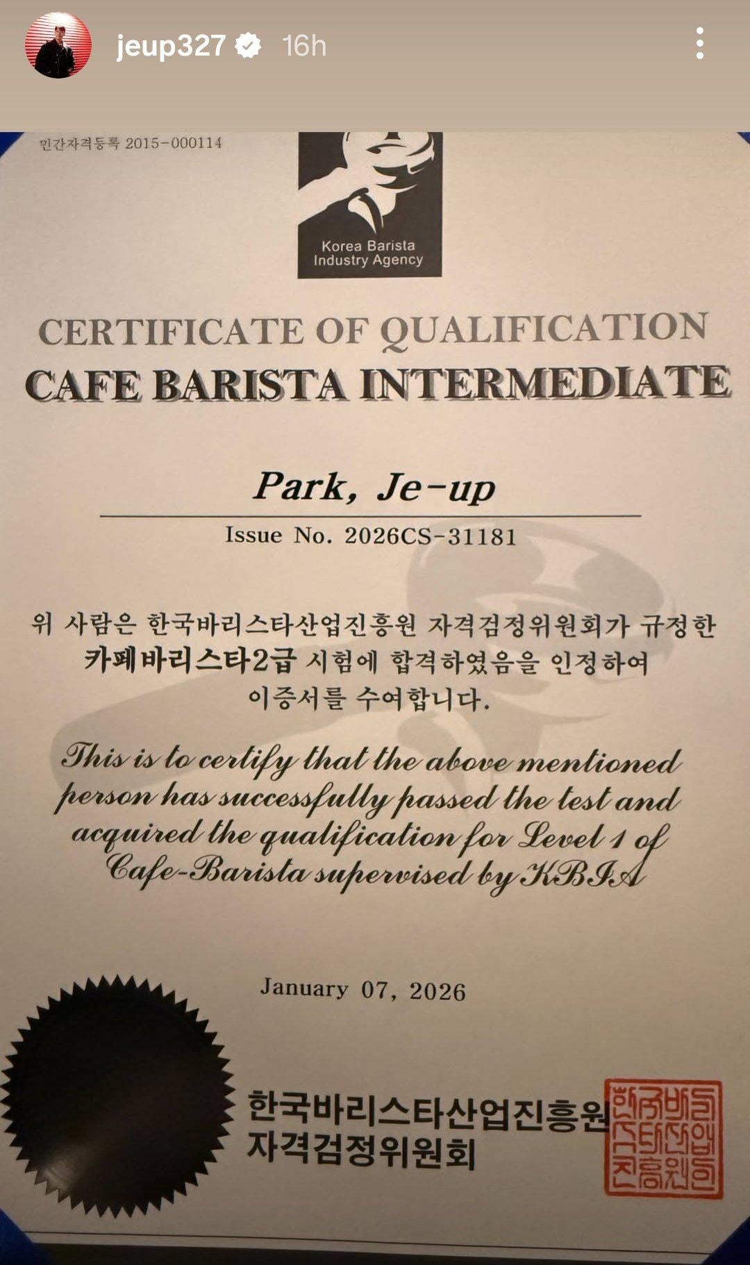 شارك Park Jeup (IMFACT سابقًا) أنه حصل على مؤهل المستوى الأول في Café Barista