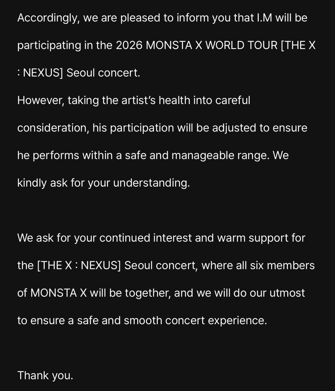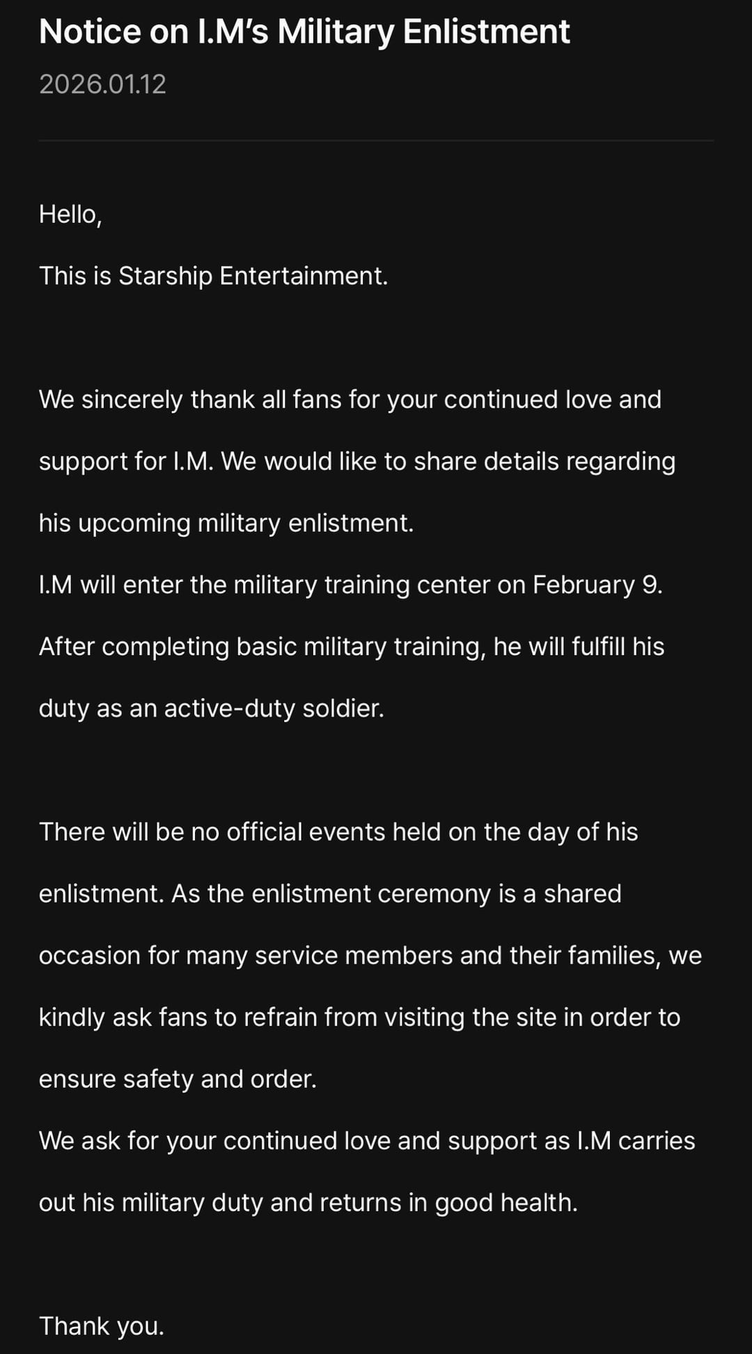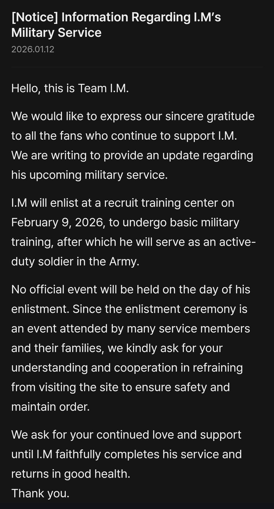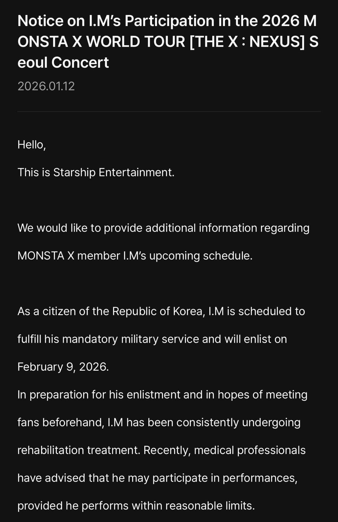 سيتم تجنيد MONSTA X IM في الجيش في 9 فبراير + وسيشارك في الجولة العالمية للفرقة لعام 2026 "THE X: NEXUS" في سيول