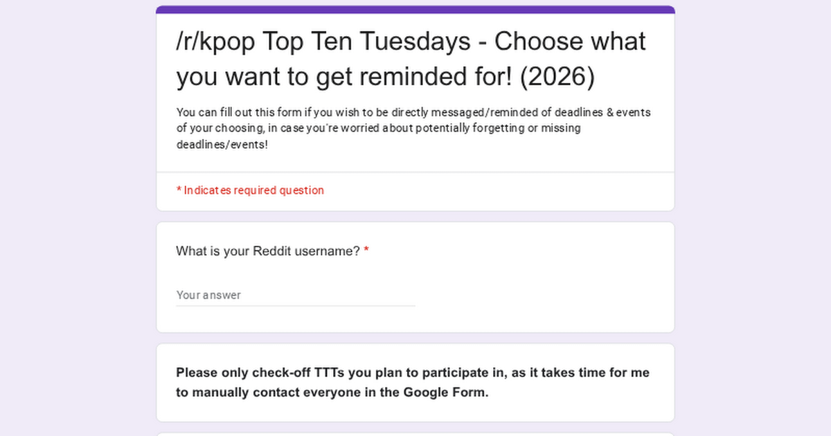 تم تحديث نموذج التذكيرات للنصف الأول من عام 2026: https://forms.gle/9SpuqQz4eLCQs8m89. يرجى التصويت في النموذج إذا كنت ترغب في أن يتم إعلامك بأي من رسائل TTT التالية!