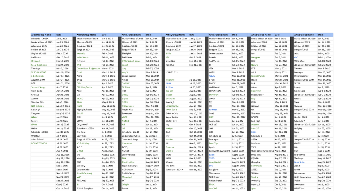 جدول بيانات Google مع جميع النتائج السابقة والجدول الزمني الكامل (تمت إضافة قوائم التشغيل المحدثة على YouTube وSpotify إلى جميع أيام الثلاثاء العشرة الأوائل الآن، وذلك بفضل ش/spaceface2223!)