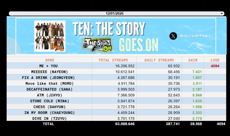 260113 تحديث OLTSupport Twitter – تجاوزت أغنية “This is For” 130 مليونًا على Spotify. كانت TWICE أيضًا هي فرقة KPop Girl الأكثر استماعًا على Spotify في 12 يناير مع 6.68 مليون استماع، مما أدى الآن إلى تمديد خطها إلى 122 يومًا على التوالي.