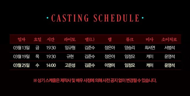 سوبر جونيور كيوهيون، كيم جونسو (XIA) ولوفليز كي سيلعبون دور Light وL وAmane Misa في عرض Death Note The Musical في 19 مارس.