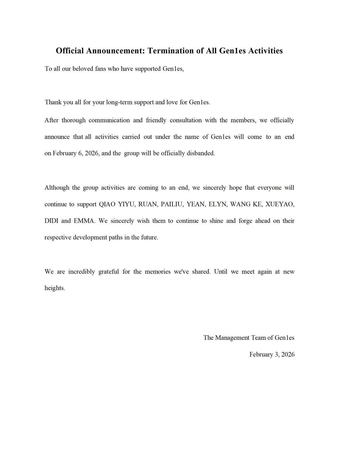 فرقة Gen1es ستتفكك رسميًا في السادس من فبراير