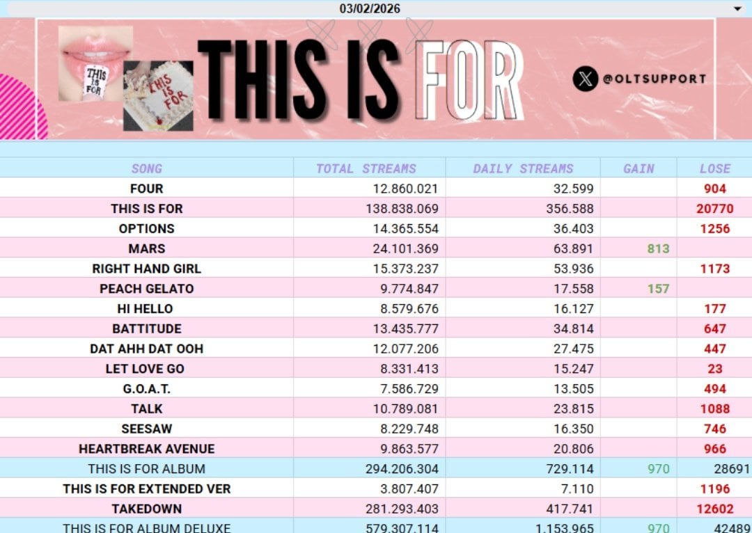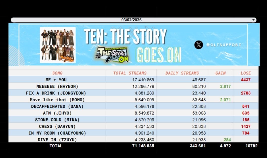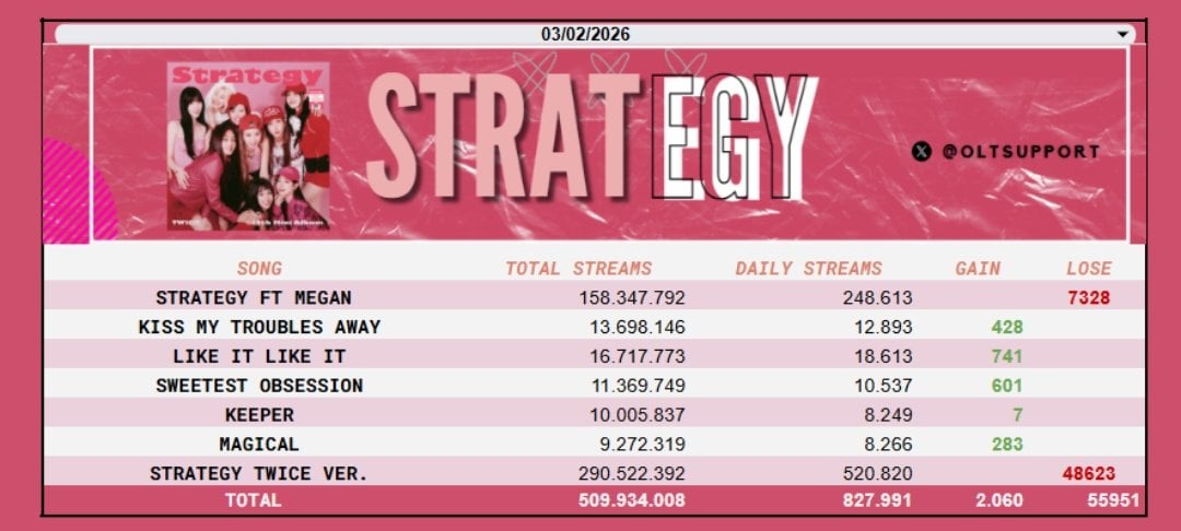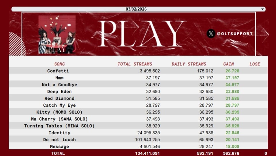 260204 تحديث تويتر OLTSupport – ألبوم “PLAY” لفرقة MISAMO يحصل على ظهور جزئي لأول مرة مع +592,191 استماعًا على Spotify. كما ظهرت لأول مرة في المرتبة الأولى على مخطط Oricon Daily Album Chart مع بيع 59680 نسخة. كانت TWICE أيضًا أكثر فرقة kpop gg استماعًا على Spotify في 3 فبراير، والآن 144 يومًا على التوالي مع 6.07 مليون.