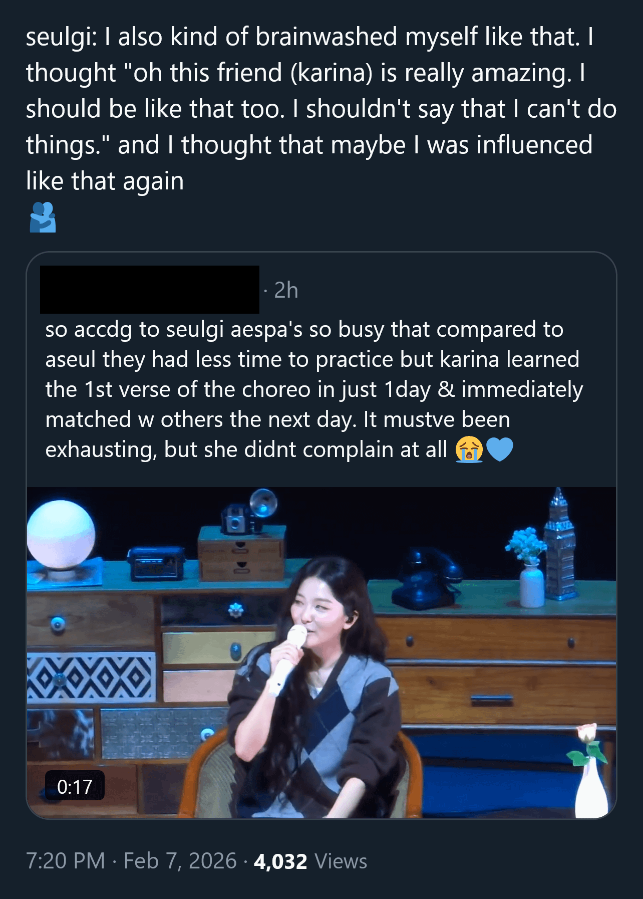 260207 سولجي تتحدث عن قصة خلف الكواليس لمسرحية Chu~♡ وهي تشيد بأخلاقيات كارينا في العمل