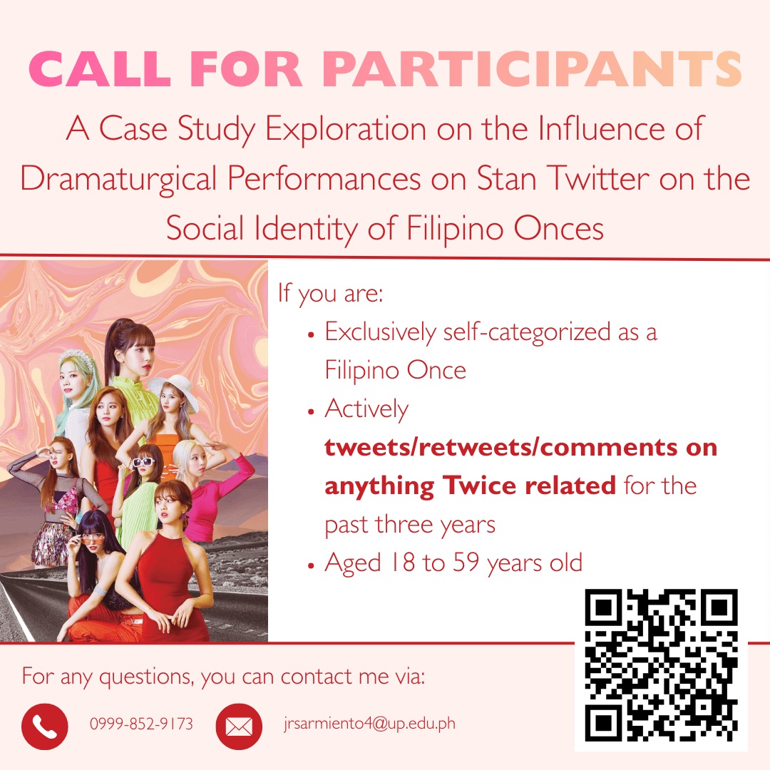 أقوم حاليًا بإعداد رسالتي الجامعية بعنوان: “دراسة حالة استكشافية حول تأثير العروض الدرامية على تويتر ستان على الهوية الاجتماعية للفلبينيين.”