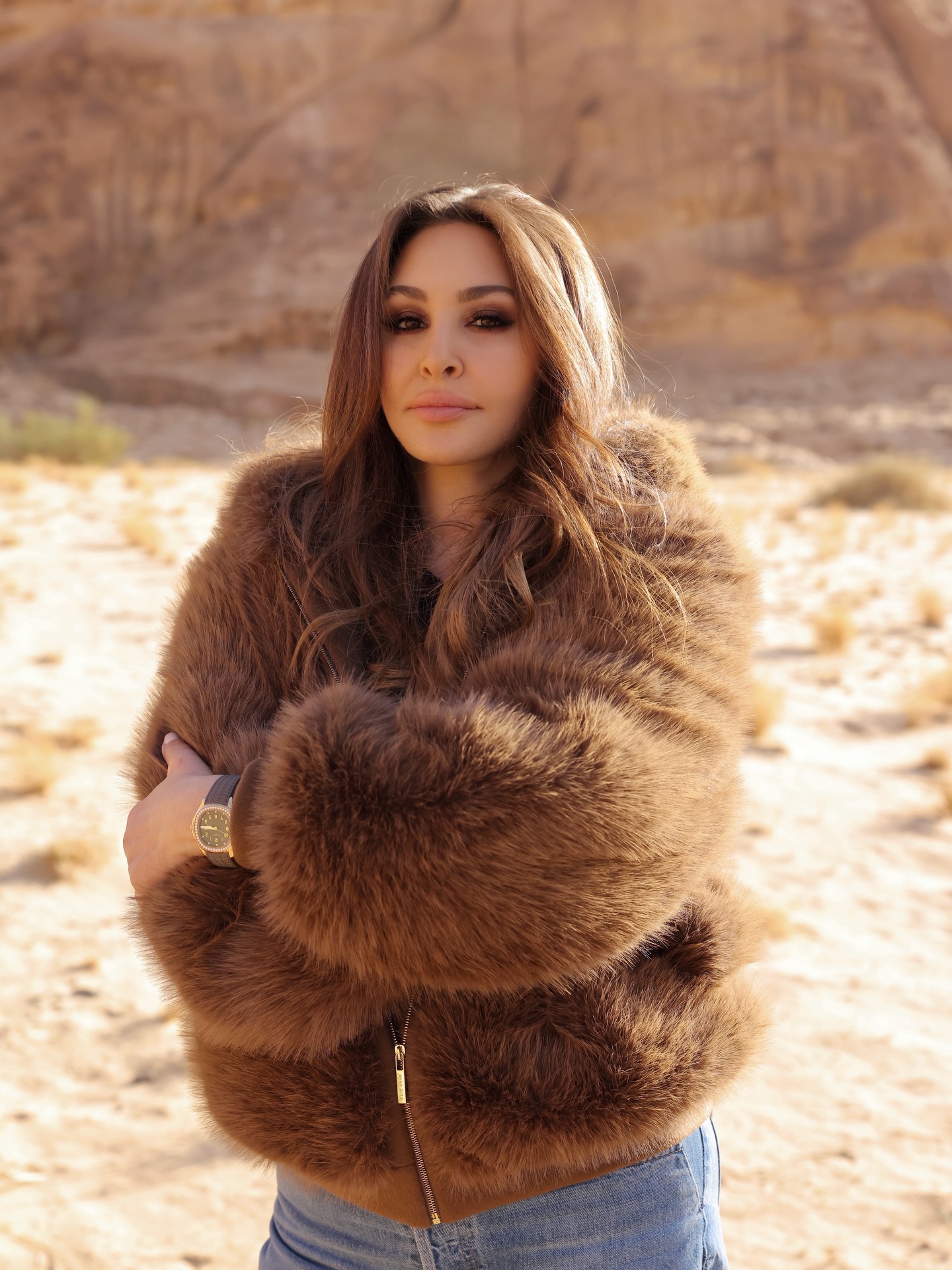 وسط مناظر العلا الطبيعية الخلابة، ظهرت إليسا بإطلالة متميزة من إيلي صعب، مزينة بالفراء، مع حذاء كريستيان ديور وساعة باتيك فيليب، لتجسد بذلك القوة والرقي والخلود الفني. الإطلالة جمعت بين الأناقة الملكية والحضور القوي، مع لمسة من العراقة التي تناسب أيقونة حقيقية في عالم الفن.