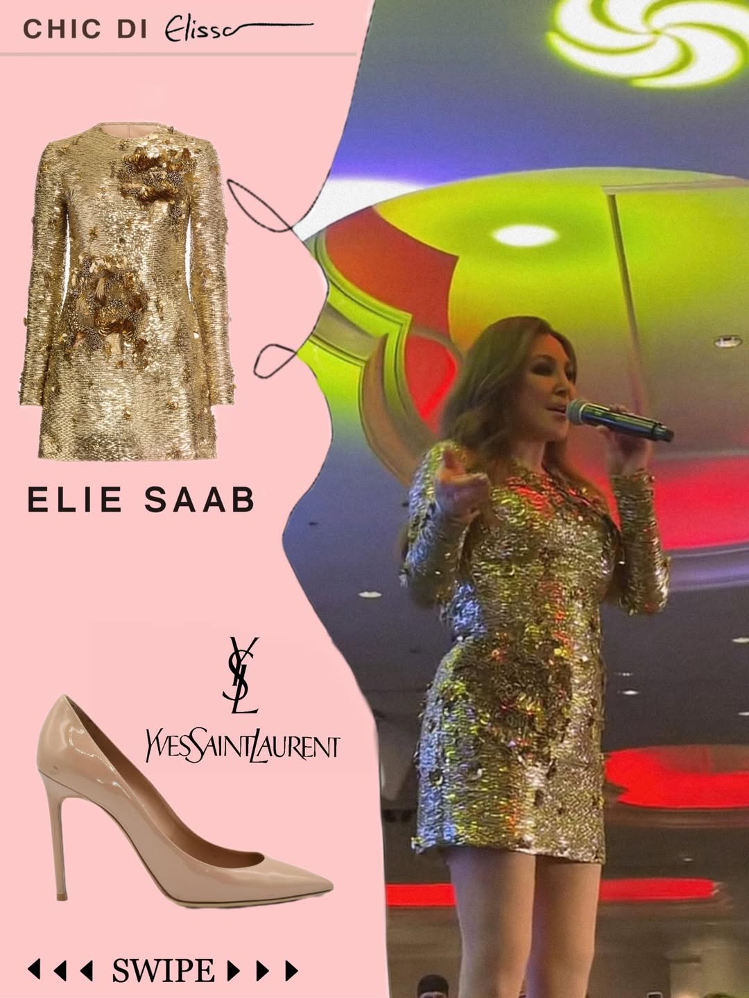 على مسرح تورنتو، اختارت إليسا فستانًا ذهبيًا من إيلي صعب، مزينًا بتفاصيل أنثوية ناعمة، مع حذاء إيف سان لوران. الإطلالة حملت ثقة لا تضاهى وقوة حضور، حيث جمع الفستان بين الفخامة والجاذبية، مع لمسة ساحرة أكملت بريق النجمة على المسرح.