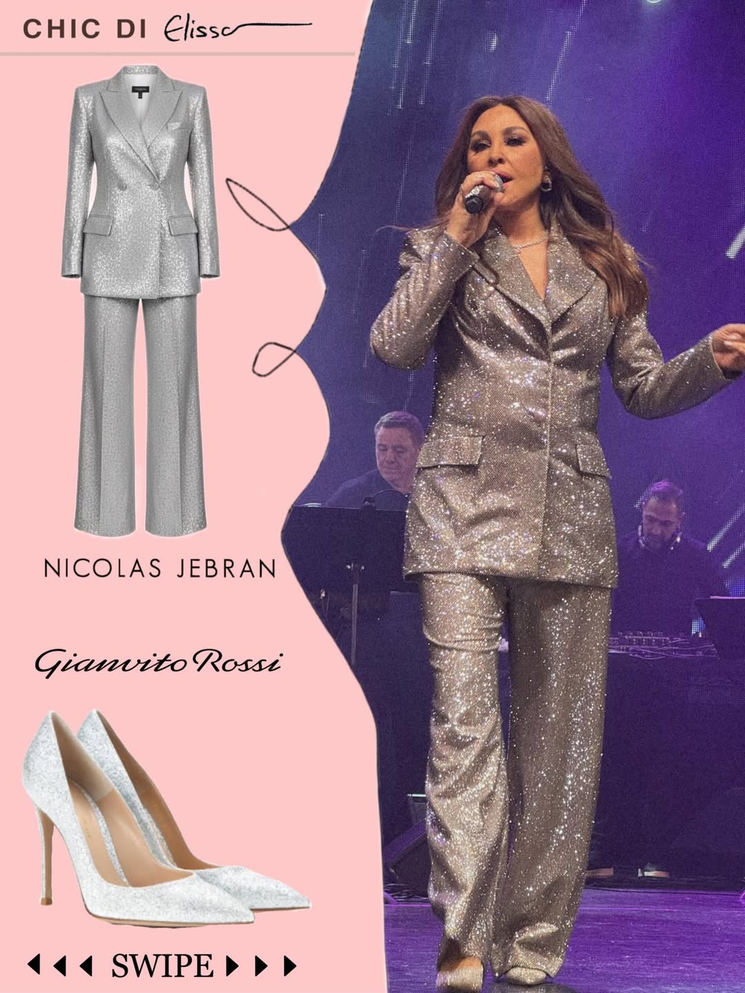 في حفل الجولة الأمريكية الثانية، خطفت إليسا الأنظار ببذلة فضية مزدانة بالتطريزات من توقيع نيكولا جبران، التي أكملت فخامتها مع حذاء جيانفيتو روسي. التصميم جمع بين القوة والرقي، مع لمسة من البريق الذي يعكس حضورها المسرحي القوي، مؤكدًا مرة أخرى مكانتها كأيقونة للأناقة العصرية.