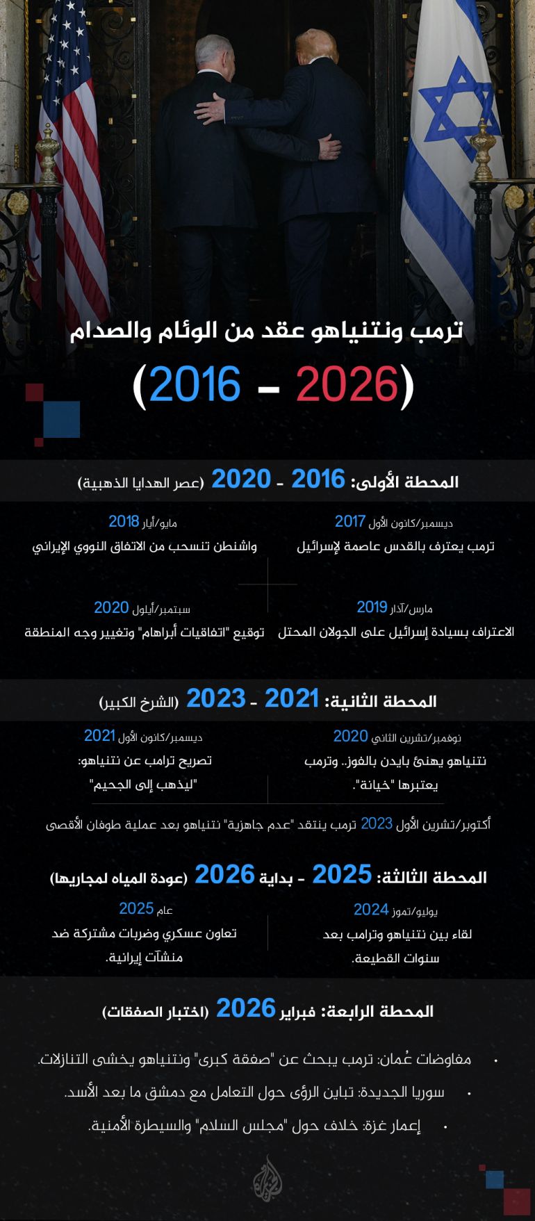 رغم استعادة مستوى عال من التعاون العسكري، تبدو زيارة نتنياهو الحالية لواشنطن (فبراير/شباط 2026) من أكثر المحطات تعقيدا، مع انتقال ثقل الدور الأمريكي من التصعيد الميداني إلى محاولات بلورة تسويات سياسية كبرى في المنطقة.