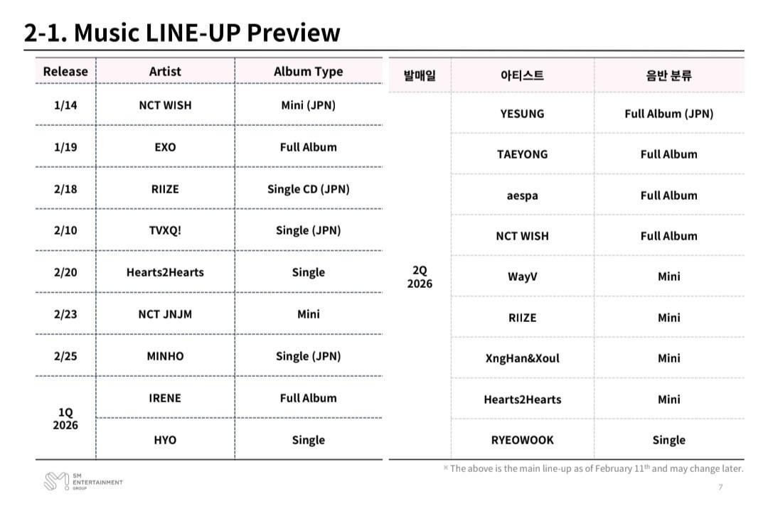 توقعت شركة SM Entertainment تشكيلة الموسيقى للربع الأول من عام 2026 والربع الثاني من عام 2026