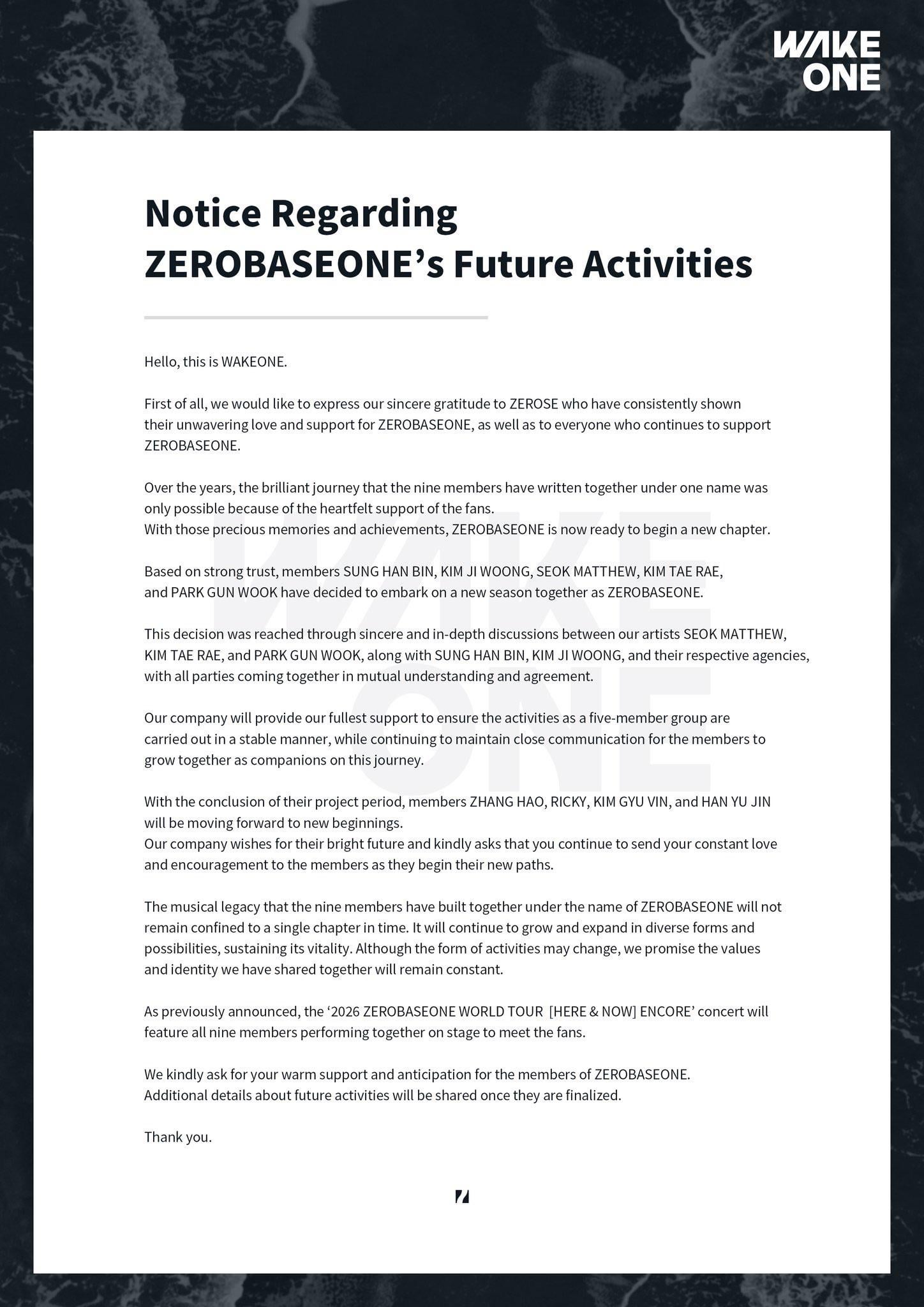 WakeOne Entertainment - إشعار بخصوص أنشطة ZEROBASEONE المستقبلية، استمرارها كخمسة أعضاء (Sung Hanbin، Kim Jiwoong، Seok Matthew، Kim Taerae، Park Gunwook)