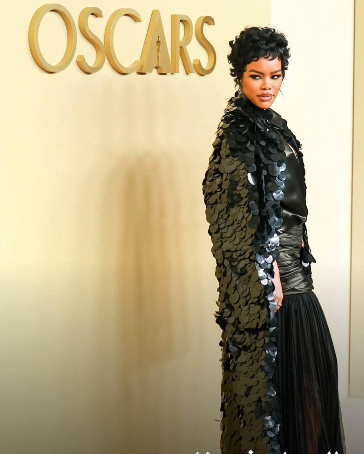 تيانا تايلور تألقت بإطلالة درامية آسرة من توقيع CONG TRI، حيث ارتدت فستانًا أسود طويلًا يجمع بين قماش شفاف ينسدل بخفة في الأسفل وجزء علوي من الساتان اللامع بقصّة مفتوحة عند الصدر. المعطف المزدان بقطع دائرية لامعة عكس الضوء ومنح الإطلالة بعدًا فنيًا لافتًا، لتجسّد مزيج القوة والأنوثة بأسلوب جريء.