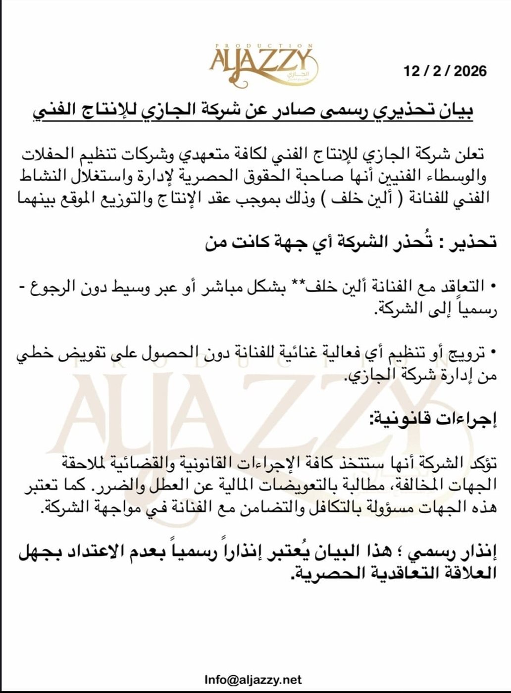كانت شركة الجازي قد أصدرت بياناً رسمياً حذرت فيه متعهدي الحفلات ومنظمي الفعاليات من التعاقد مع إلين خلف دون إذن خطي منها، مدعية امتلاكها حقوقاً حصرية لإدارة واستغلال نشاطها الفني. وما أثار الريبة في الوسط الفني هو توقيت صدور البيان، إذ جاء قبل ساعات قليلة من موعد حفل إلين في بيروت والمؤتمر الصحفي المصاحب له، في خطوة اعتبرها مراقبون محاولة واضحة للضغط على الفنانة وإرباك عودتها.