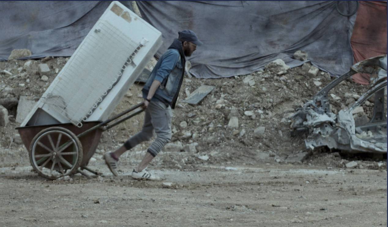 يُفتتح الفيلم بحشد من الأهالي أمام شاحنة توزّع أكياس المؤونة. أحد هؤلاء رجل هزيل اسمه عرفات (نديم ريماوي) يكاد لا يقوى على الوقوف. يُرمى إليه كيس أبيض، لكن ما إن يتلقاه حتى يسرقه منه آخر ويهرب به. يقف عرفات وحيداً. تفرّق الجمع بعد أن فرغت الشاحنة من حمولتها، وبقي هو يراقبها. يعود إلى بيته بصعوبة. رجل يمكن تصديق أنه لم يأكل منذ يومين أو ثلاثة. وما إن يصل حتى يعاود البحث عن طعام، ثم يحاول النوم. يطرق شاب الباب ويمنحه رغيفاً.
