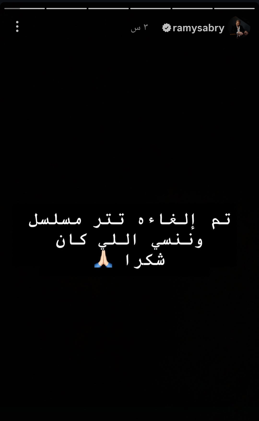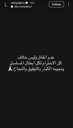 رامي صبري يتمنى لفريق عمل المسلسل التوفيق والنجاحومن خلال خاصية “ستوري” عبر حسابه الخاص بـ”إنستغرام”، كتب الفنان رامي صبري منشورًا قال فيه: “عدم اتفاق وليس خلاف، كل الاحترام لكل أبطال المسلسل ونجومه الكبار بالتوفيق والنجاح”.
