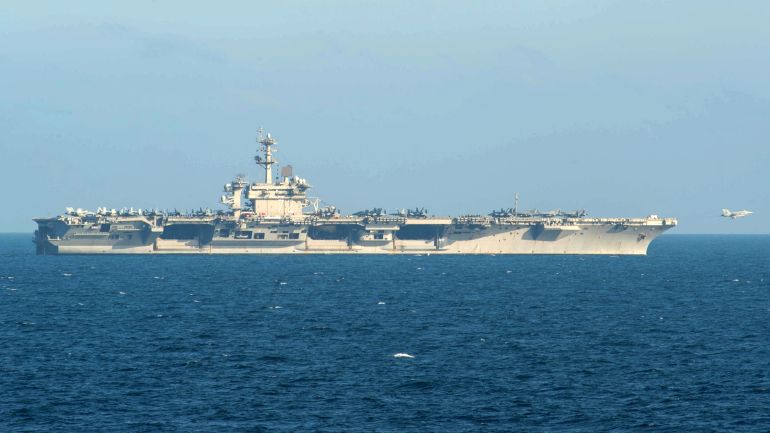 تشير وكالة الصحافة الفرنسية إلى أن الجيش الأميركي ينشر حاليا 13 سفينة حربية في منطقة الشرق الأوسط، تتقدمها حاملة الطائرات “يو أس أس أبراهام لينكولن” التي تُبحر على مسافة مئات الكيلومترات من السواحل الإيرانية، ومعها تسع مدمرات وثلاث فرقاطات.