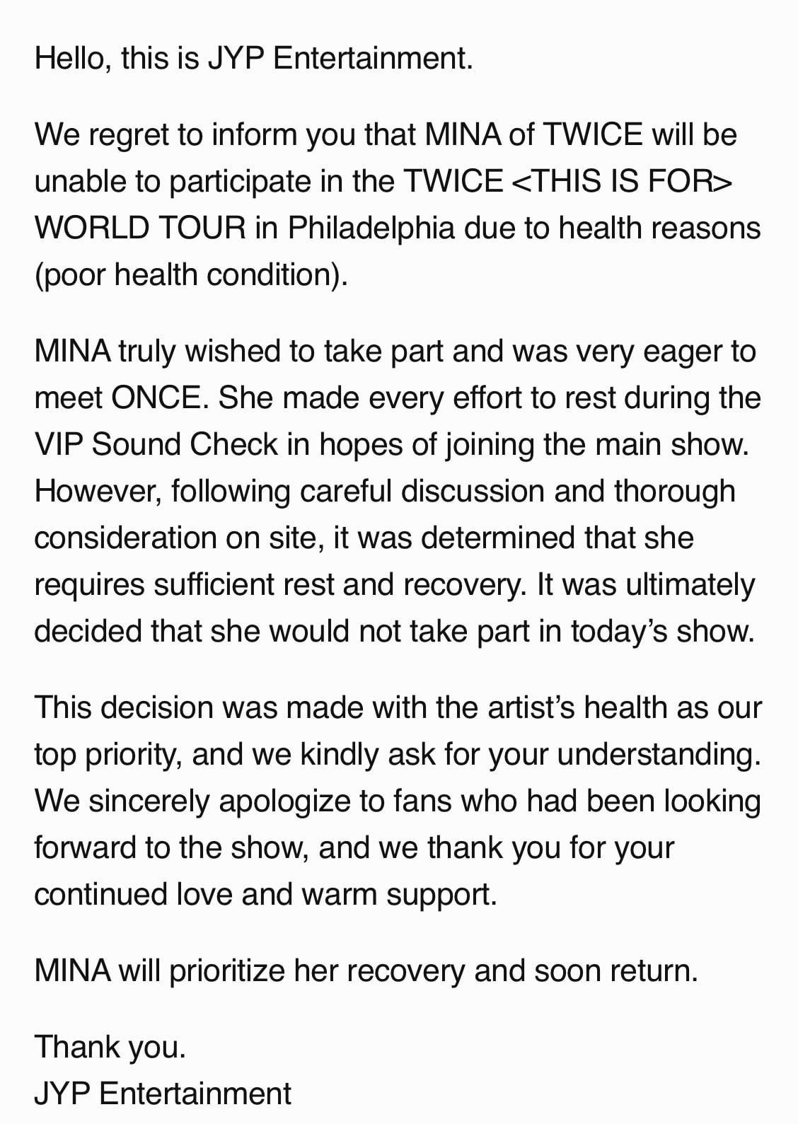 [TWICE] 260225 تحديث المعجبين – مينا ستغيب عن توايس في فيلادلفيا